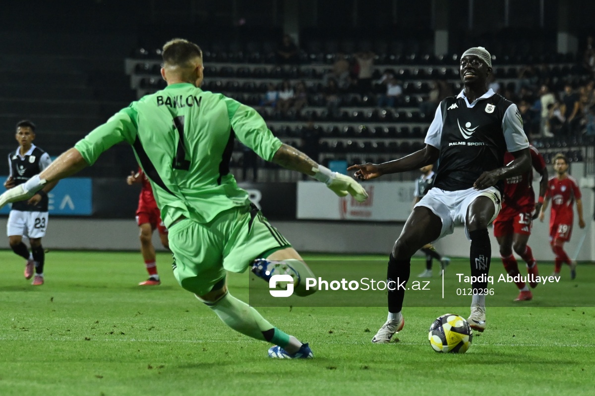 29.08.2025 “Neftçi Arena”, Misli Premyer Liqasının “Neftçi” – “Turan Tovuz” oyununda “Turan Tovuz” futbol klubunun oyunçusu Oleq Baklov (sol), “Neftçi” futbol klubunun oyunçusu Bassala Sambu (sağ) mübarizəsi.