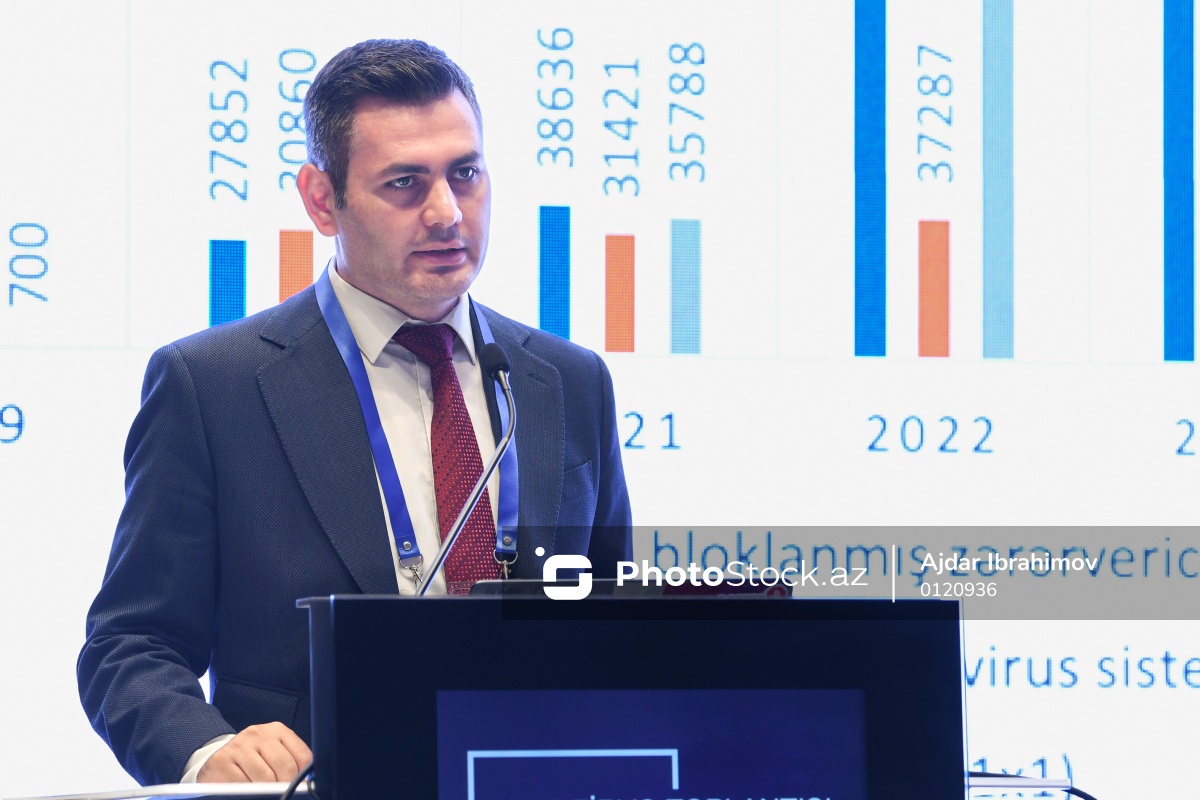 “Dövlət qurumlarının İT rəhbərlərinin VI Zirvə Toplantısı”nda çıxış edən Xüsusi Rabitə və İnformasiya Təhlükəsizliyi Dövlət Xidmətinin (XRİTDX) idarə rəisi Tural Məmmədov.