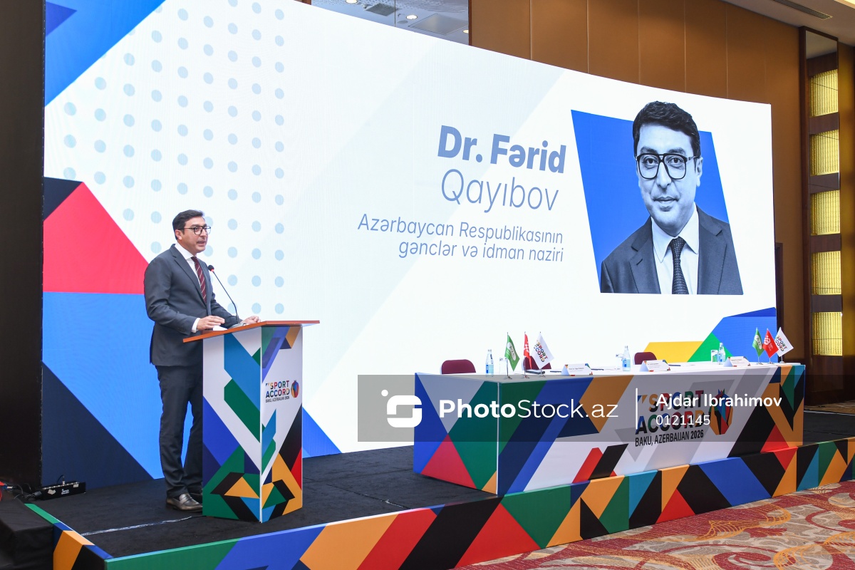 SportAccord Dünya İdman və Biznes Sammiti ilə bağlı müqavilənin imzalanma mərasimində çıxış edən Azərbaycan Respublikasının gənclər və idman naziri Fərid Qayıbov.