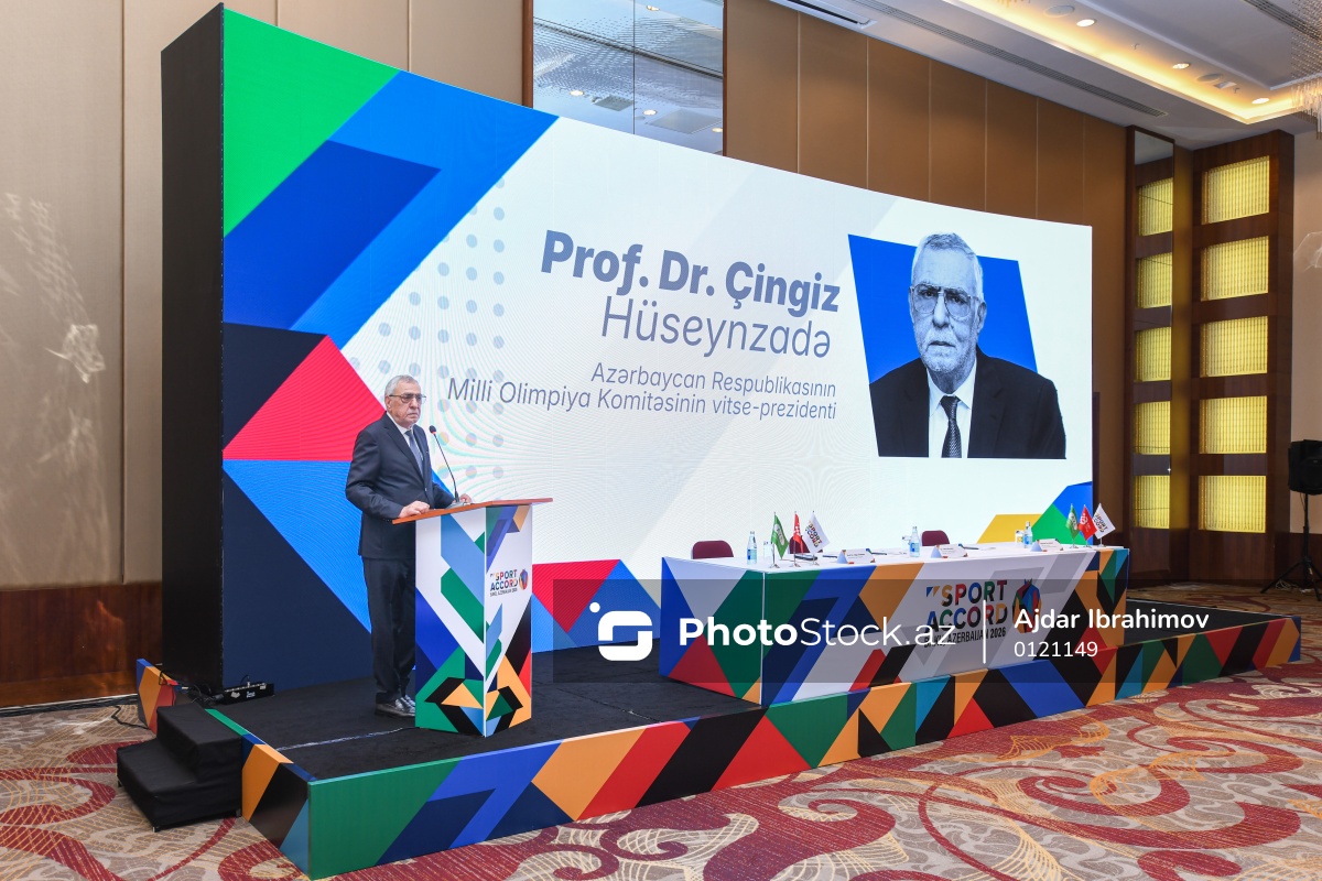 SportAccord Dünya İdman və Biznes Sammiti ilə bağlı müqavilənin imzalanma mərasimində çıxış edən Milli Olimpiya Komitəsinin (MOK) vitse-prezidenti Çingiz Hüseynzadə.