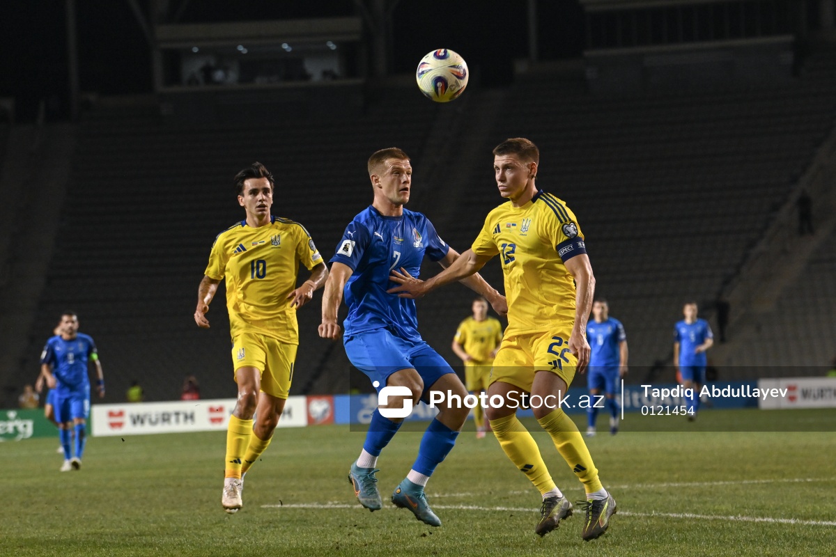 09.09.2025 Tofiq Bəhramov adına Respublika stadionu, DÇ-2026-nın seçmə mərhələsində Azərbaycan – Ukrayna oyununda Ukrayna millisinin oyunçuları Mikola Şaparenko (solda) və Mikola Matviyenko (sağda) ilə Azərbaycan millisinin oyunçusu Anatoli Nuriyev (ortada) mübarizəsi.