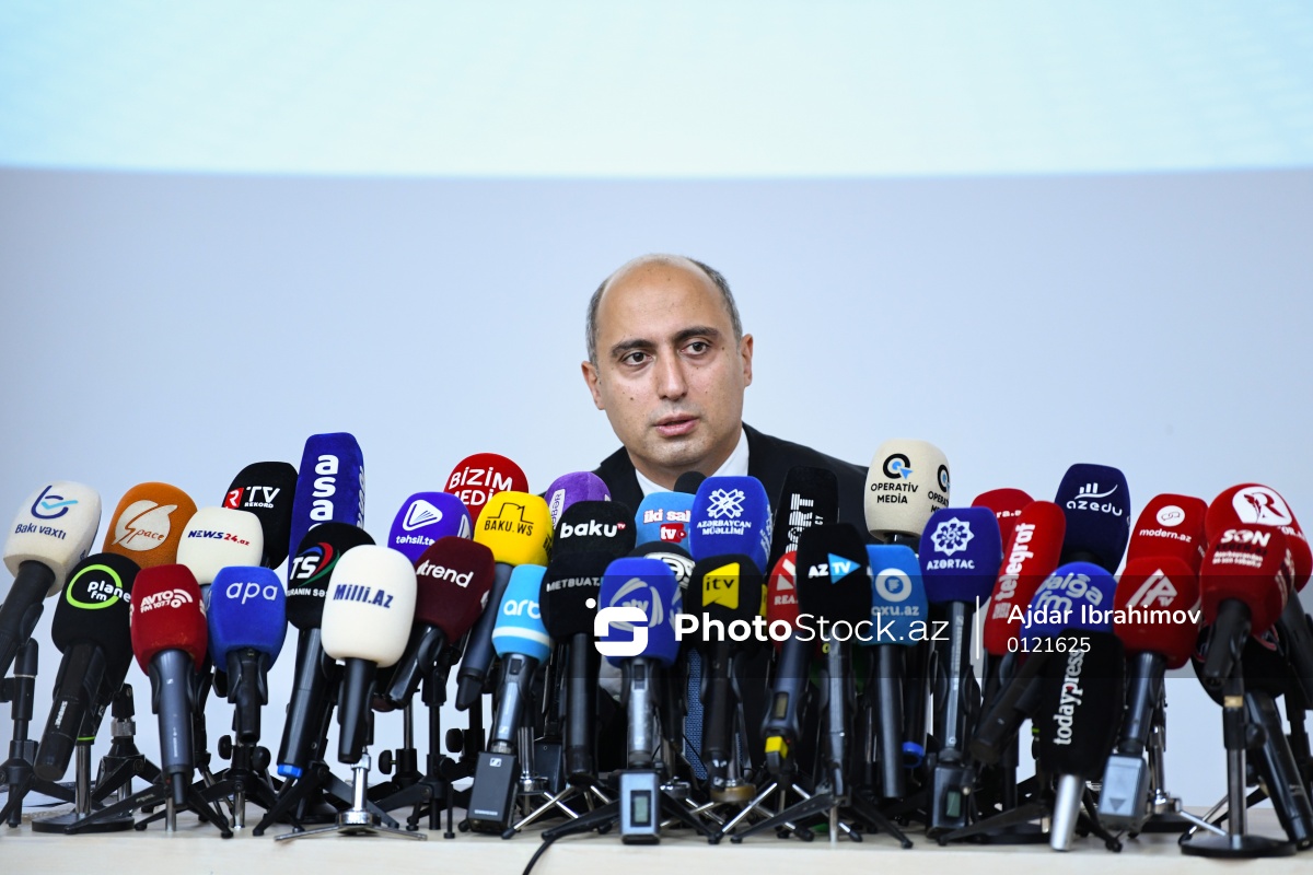 Yeni tədris ili ilə bağlı brifinqdə çıxış edən Azərbaycan Respublikasının Elm və Təhsil naziri Emin Əmrullayev.