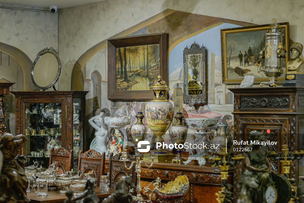 Qədim əşyaların yer aldığı mağazada XVIII–XIX əsrə aid nadir incəsənət nümunələri görmək mümkündür. Mağazadakı əşyaların bir qismi, xüsusilə  xalçalar və qədim samovarlar Azərbaycana məxsus olsa da, Fransa, İtaliya və Rusiya kimi ölkələrdən də gətirilmiş xeyli sayda unikal nümunələr yer alır. Bunların arasında olan samovarlar, zərif işləməli qab-qacaqlar, klassik üslublu mebellər, əl toxuması xalçalar, qədim sobalar, dəbdəbəli saat və şamdanlar keçmiş dövrlərin izlərini daşıyır. Gümüş, bürünc və qızıl suyundan hazırlanmış əntiq əşyalar təkcə zəngin görünüşü ilə deyil, həm də zərif sənətkarlıq işi ilə seçilir.