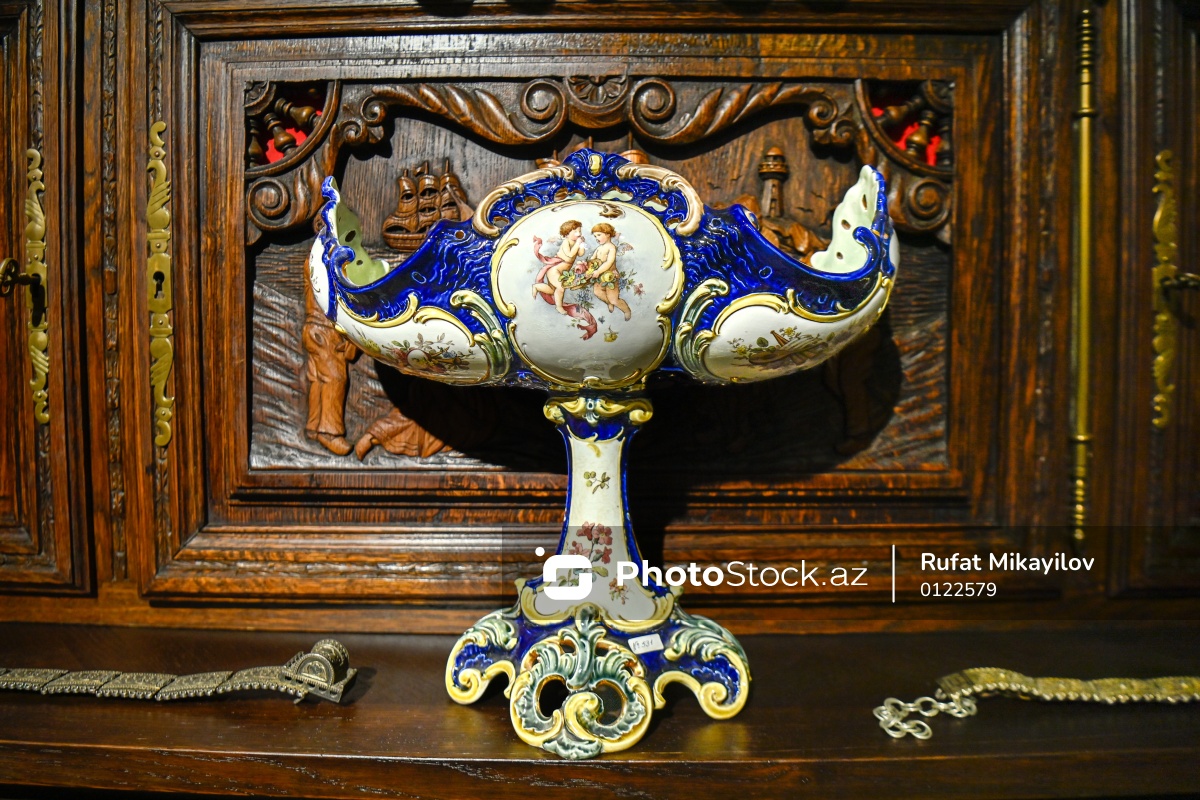 Qədim əşyaların yer aldığı mağazada XVIII–XIX əsrə aid nadir incəsənət nümunələri görmək mümkündür. Mağazadakı əşyaların bir qismi, xüsusilə  xalçalar və qədim samovarlar Azərbaycana məxsus olsa da, Fransa, İtaliya və Rusiya kimi ölkələrdən də gətirilmiş xeyli sayda unikal nümunələr yer alır. Bunların arasında olan samovarlar, zərif işləməli qab-qacaqlar, klassik üslublu mebellər, əl toxuması xalçalar, qədim sobalar, dəbdəbəli saat və şamdanlar keçmiş dövrlərin izlərini daşıyır. Gümüş, bürünc və qızıl suyundan hazırlanmış əntiq əşyalar təkcə zəngin görünüşü ilə deyil, həm də zərif sənətkarlıq işi ilə seçilir.
