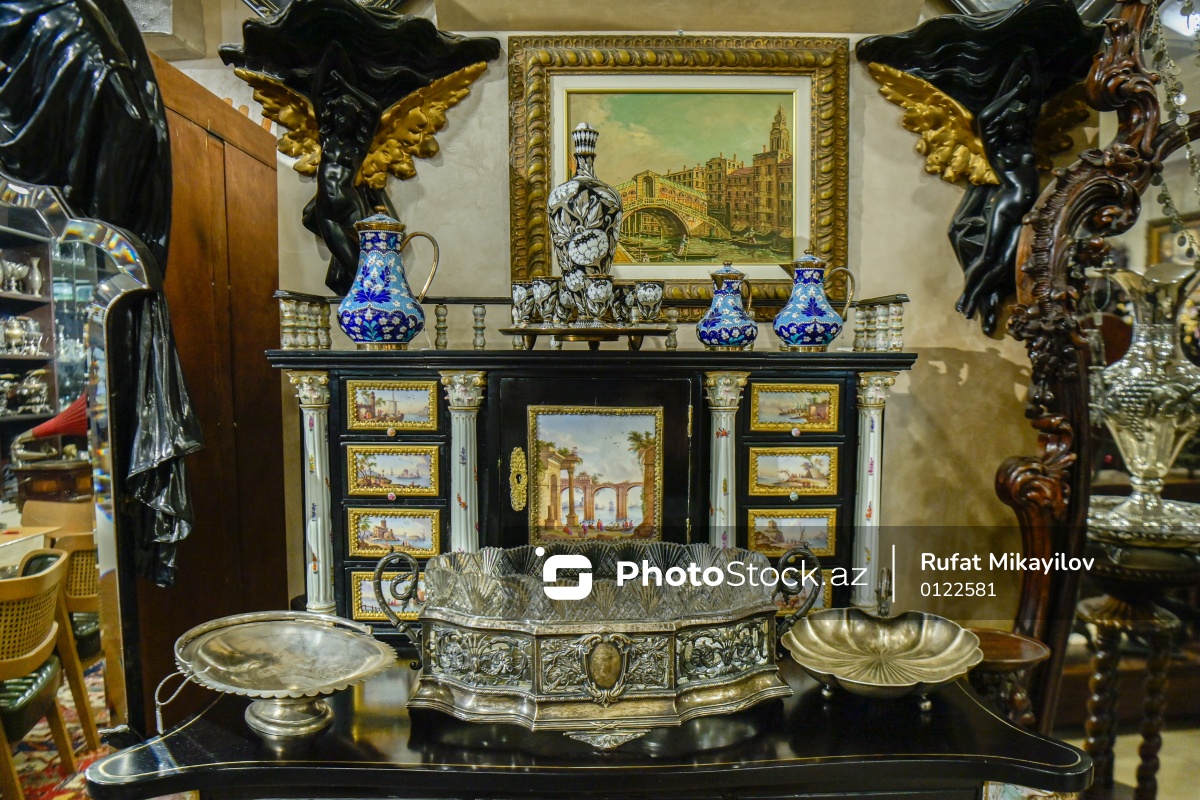 Qədim əşyaların yer aldığı mağazada XVIII–XIX əsrə aid nadir incəsənət nümunələri görmək mümkündür. Mağazadakı əşyaların bir qismi, xüsusilə  xalçalar və qədim samovarlar Azərbaycana məxsus olsa da, Fransa, İtaliya və Rusiya kimi ölkələrdən də gətirilmiş xeyli sayda unikal nümunələr yer alır. Bunların arasında olan samovarlar, zərif işləməli qab-qacaqlar, klassik üslublu mebellər, əl toxuması xalçalar, qədim sobalar, dəbdəbəli saat və şamdanlar keçmiş dövrlərin izlərini daşıyır. Gümüş, bürünc və qızıl suyundan hazırlanmış əntiq əşyalar təkcə zəngin görünüşü ilə deyil, həm də zərif sənətkarlıq işi ilə seçilir.