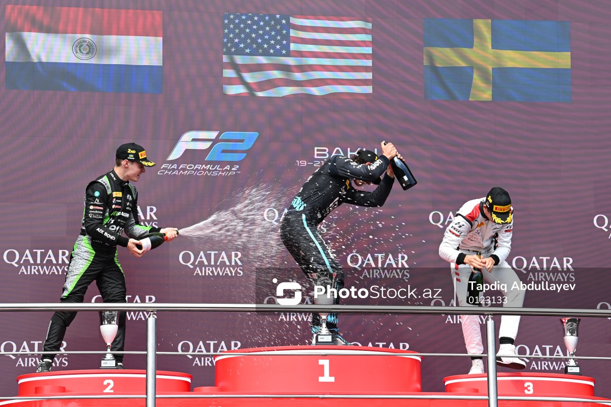 2025-ci ildə Bakıda keçirilən "Formula 2" üzrə əsas yarışın mükafatlandırma mərasimində iştirak edən (soldan-sağa) "Formula 2" üzrə Azərbaycan Qran-prisinin ikincisi "AIX Racing" komandasının pilotu Joshua Dürksen, "Formula 2" üzrə Azərbaycan Qran-prisinin qalibi "Dams Lukas Oil" komandasının pilotu Jak Crawford və "Formula 2" üzrə Azərbaycan Qran-prisinin üçüncüsü "Hitex TGR" komandasının pilotu Dino Beganovic.