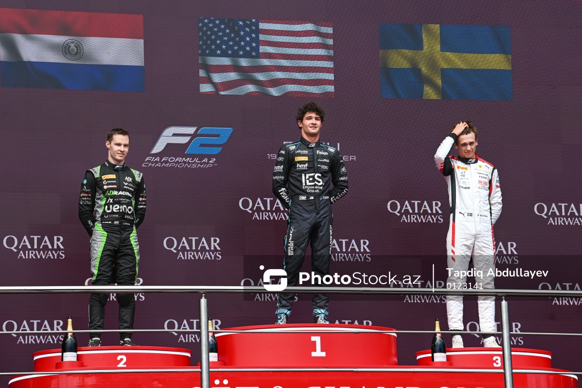 2025-ci ildə Bakıda keçirilən "Formula 2" üzrə əsas yarışın mükafatlandırma mərasimində iştirak edən (soldan-sağa) "Formula 2" üzrə Azərbaycan Qran-prisinin ikincisi "AIX Racing" komandasının pilotu Joshua Dürksen, "Formula 2" üzrə Azərbaycan Qran-prisinin qalibi "Dams Lukas Oil" komandasının pilotu Jak Crawford və "Formula 2" üzrə Azərbaycan Qran-prisinin üçüncüsü "Hitex TGR" komandasının pilotu Dino Beganovic.