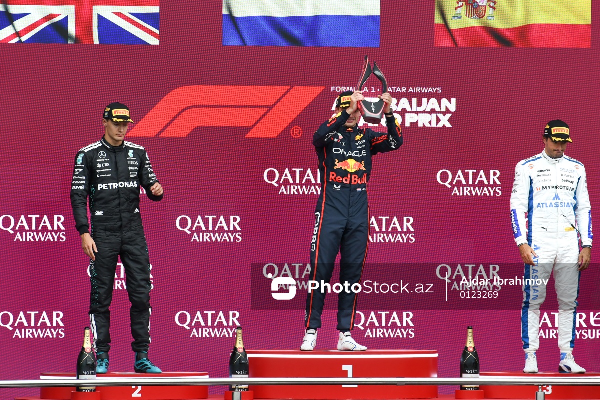 2025-ci ildə Bakıda keçirilən "Formula 1" üzrə Azərbaycan Qran-prisinin mükafatlandırma mərasimində iştirak edən (soldan-sağa) "Mercedes" komandasının pilotu George Russell, "Redd Bull" komandasının pilotu Max Verstappen və "Williams" komandasının pilotu Carlos Sainz.