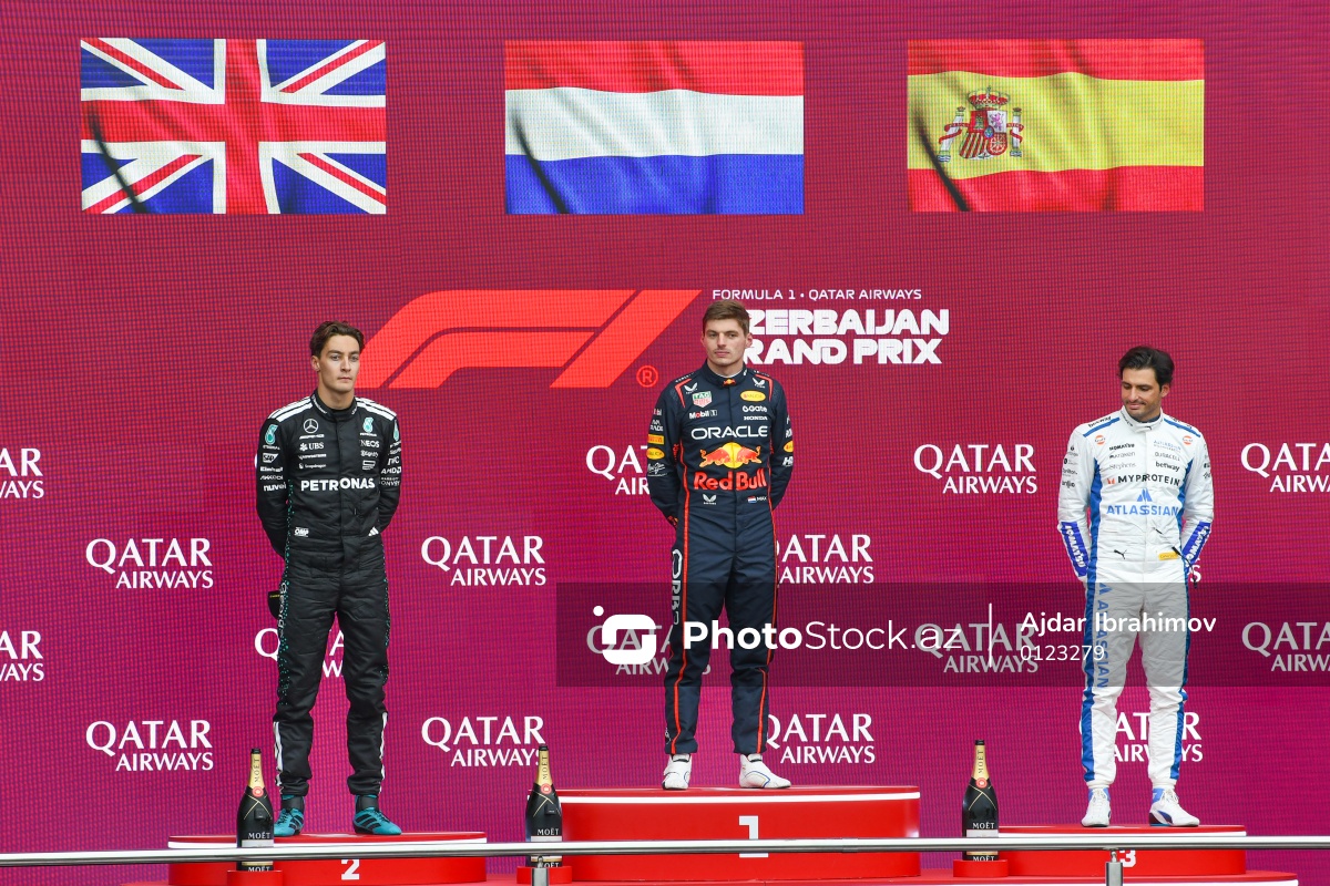 2025-ci ildə Bakıda keçirilən "Formula 1" üzrə Azərbaycan Qran-prisinin mükafatlandırma mərasimində iştirak edən (soldan-sağa) "Mercedes" komandasının pilotu George Russell, "Redd Bull" komandasının pilotu Max Verstappen və "Williams" komandasının pilotu Carlos Sainz.