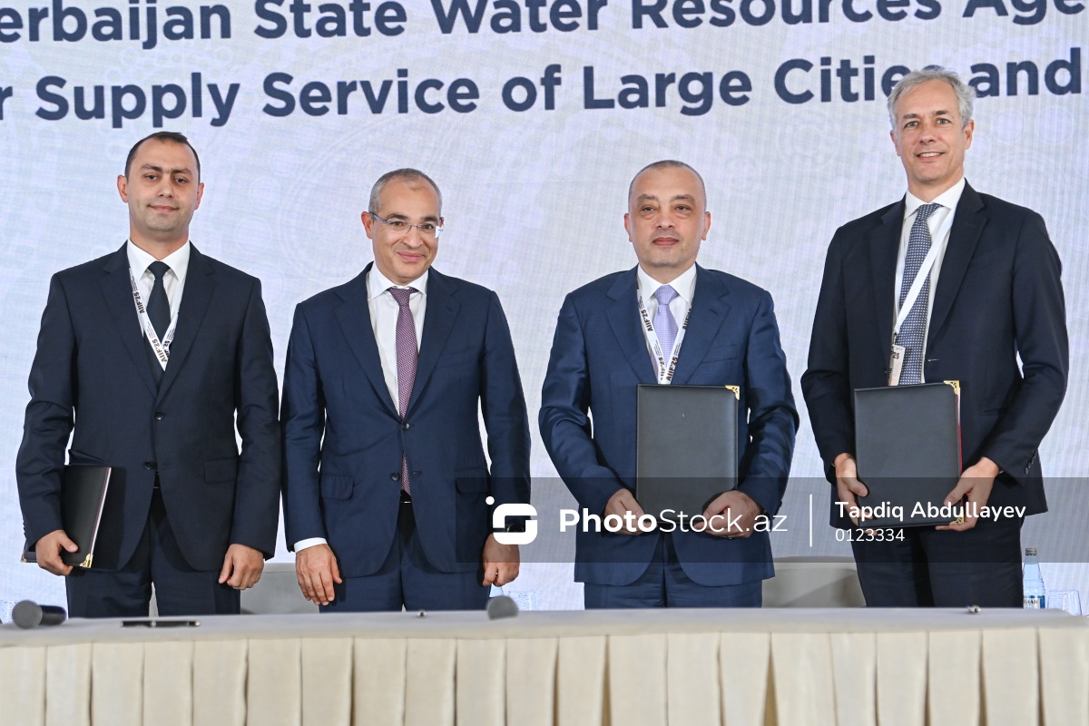 I Azərbaycan Beynəlxalq İnvestisiya Forumunda (AIIF 2025) iştirak edən (soldan-sağa) "Böyük Şəhərlərin Birləşmiş Su Təchizatı Xidməti" publik hüquqi şəxsin İdarə Heyətinin sədri Tahir Xəlilov, Azərbaycan Respublikasının iqtisadiyyat naziri Mikayıl Cabbarov, Azərbaycan Dövlət Su Ehtiyatları Agentliyinin (ADSEA) sədri Zaur Mikayılov və "ACWA Power" şirkətinin baş icraçı direktoru Marko Arçelli (Marco Arcelli).