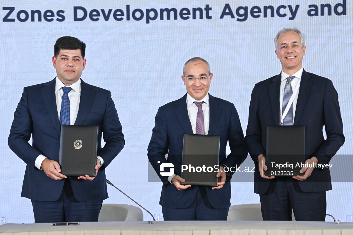 I Azərbaycan Beynəlxalq İnvestisiya Forumunda (AIIF 2025) iştirak edən (soldan-sağa) İqtisadi Zonaların İnkişafı Agentliyinin İdarə Heyətinin sədri Seymur Adıgözəlov, Azərbaycan Respublikasının iqtisadiyyat naziri Mikayıl Cabbarov və "ACWA Power" şirkətinin baş icraçı direktoru Marko Arçelli (Marco Arcelli).