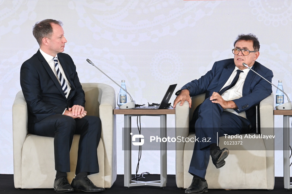 I Azərbaycan Beynəlxalq İnvestisiya Forumunda (AIIF 2025) iştirak edən panel sessiyanın moderatoru Toby Gregory (sol) və "Roubini Macro Associates"in CEO-su Nuriel Rubini (sağ).
