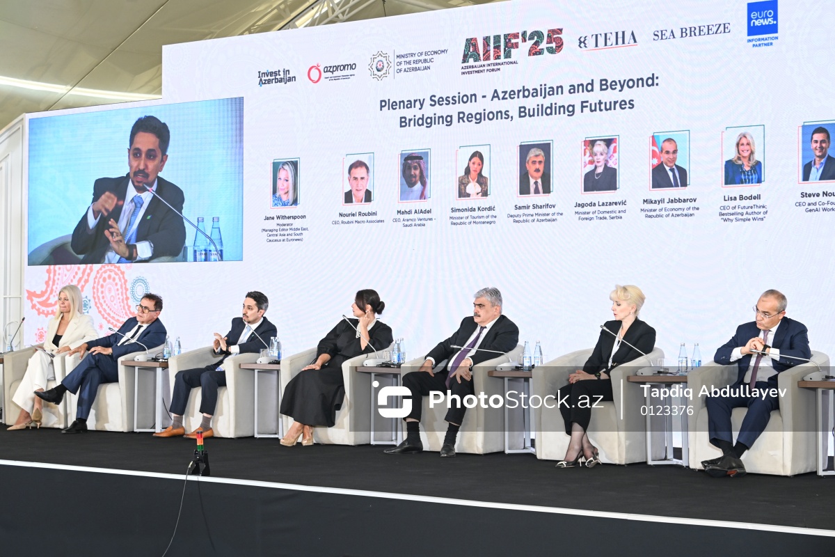 I Azərbaycan Beynəlxalq İnvestisiya Forumunda (AIIF 2025) iştirak edən (soldan-sağa) "Euronews"un Yaxın Şərq, Mərkəzi Asiya və Cənubi Qafqaz üzrə idarəedici redaktoru Jane Witherspoon, "Roubini Macro Associates"in CEO-su Nuriel Rubini, "Aramco Ventures"in baş icraçı direktoru Mahdi Al-Adel, Monteneqronun turizm naziri Simonida Kordiç, Baş nazirin müavini Samir Şərifov, Serbiyanın daxili və xarici ticarət naziri Yaqoda Lazareviç, Azərbaycan Respublikasının iqtisadiyyat naziri Mikayıl Cabbarov.