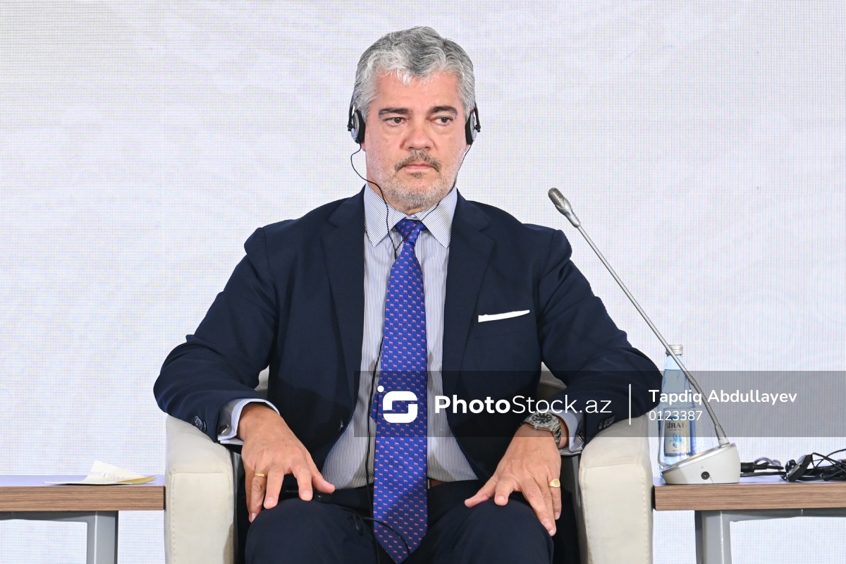 I Azərbaycan Beynəlxalq İnvestisiya Forumunda (AIIF 2025) iştirak edən braziliyalı siyasi iqtisadçı və Yeni İnkişaf Bankının sabiq prezidenti Markos Prado Troyxo (Marcos Troyjo).