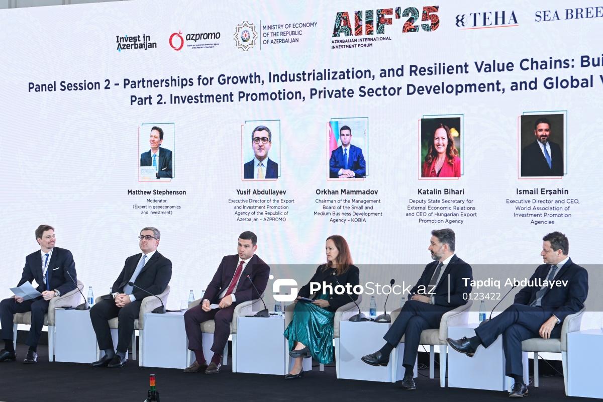 I Azərbaycan Beynəlxalq İnvestisiya Forumu (AIIF 2025) çərçivəsində “Artım, sənayeləşmə və dayanıqlı dəyər zəncirləri üçün tərəfdaşlıqlar: Gələcəyə hazır iqtisadiyyatların qurulması” mövzusunda panel sessiyasında iştirak edən (soldan-sağa) panel sessiyanın moderatoru, geoiqtisadiyyat və investisiyalar üzrə ekspert Matthew Stephenson, AZPROMO-nun icraçı direktoru Yusif Abdullayev, KOBİA-nın İdarə Heyətinin sədri Orxan Məmmədov, Macarsıtan Xarici İqtisadi Əlaqələr üzrə Dövlət Katibinin müavini və Macarıstan İxracın Təşviqi Agentliyinin İcraçı direktoru Katalin Bihari, İnvestisiya Təşviqi Agentliklərinin Dünya Assosiasiyasının icraçı direktoru və baş direktoru İsmayıl Erşahin, “Bank Leumi”nin sabiq icraçı sədri Samer Hac-Yehia.
