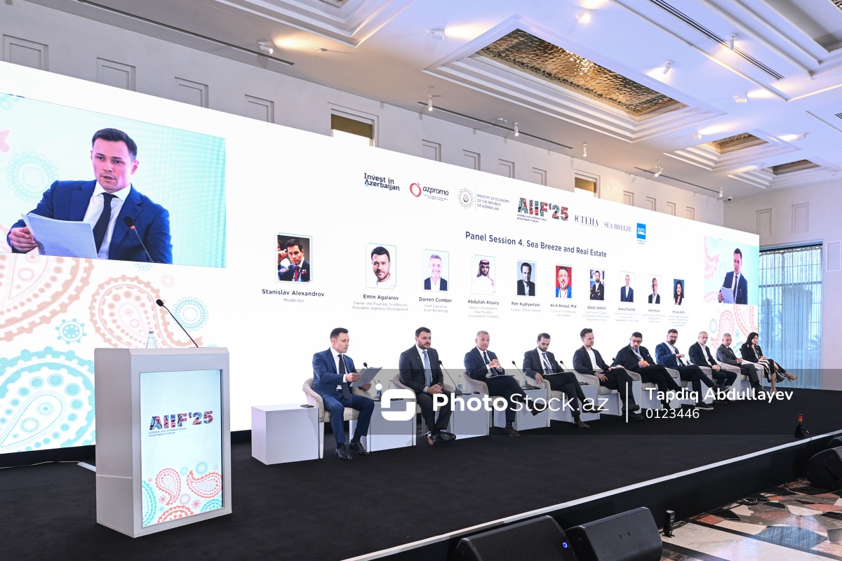 I Azərbaycan Beynəlxalq İnvestisiya Forumu (AIIF 2025) çərçivəsində “Sea Breeze and Real Estate” mövzusunda panel sessiyasında iştirak edən (soldan-sağa) moderator, “Agalarov Development” şirkətinin nümayəndəsi Stanislav Alexandrov, "Sea Breeze"in təsisçisi Emin Ağalarov, “Scott Brovnrigg” şirkətinin baş icraçı direktoru Darren Comber, “New Murabba Development” şirkətinin inkişaf üzrə direktoru Abdullah Alsuiry, “CM İnternational” şirkətinin təsisçisi Petr Kudryavtsev, memarlıq və şəhərsalma üzrə professor Ali Alraouf, "Radisson Hotel Group"un Şərqi Avropada biznesin inkişafı üzrə vitse-prezidenti David Jenkins, "Intercontinental Hotel Group"un MDB, Türkiyə və İsrail üzrə inkişaf direktoru Aleksis Feuillat, “Merit Hotels & Casinos” şirkətinin beynəlxalq marketinq üzrə vitse-prezidenti Umut Kara, “MEAIT & Rixos & All-Inclusive Collection” şirkətinin  böyük meneceri Ritvika Sethi.
