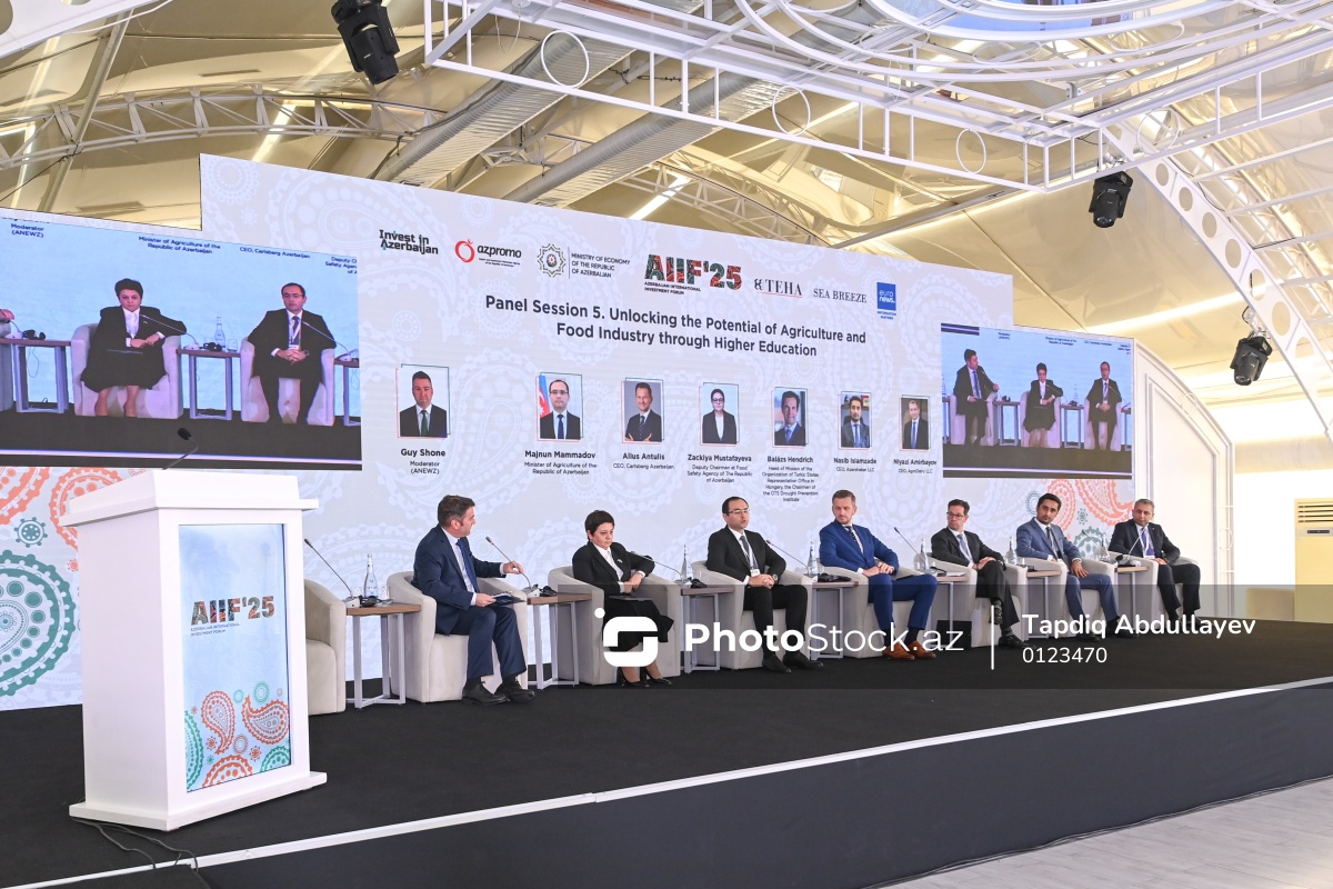 I Azərbaycan Beynəlxalq İnvestisiya Forumunun (AIIF 2025) ikinci günündə iştirak edən (soldan-sağa) moderator, "ANEWZ"un baş redaktoru Guy Shone, Qida Təhlükəsizliyi Agentliyinin sədrinin müavini Zəkiyyə Mustafayeva, Azərbaycan Respublikası Kənd təsərrüfatı naziri Məcnun Məmmədov, "Carlsberg Azərbaycan"nın Baş icraçı direktoru Alius Antulis və Macarıstandakı Türk Dövlətləri Təşkilatının Nümayəndəlik Ofisinin rəhbəri Balazs Hendrich, “Azərşəkər” Məhdud Məsuliyyətli Cəmiyyətinin baş icraçı direktoru Nəsib İslamzadə və “Agro Dairy”nin icraçı direktoru Niyazi Əmirbəyov.