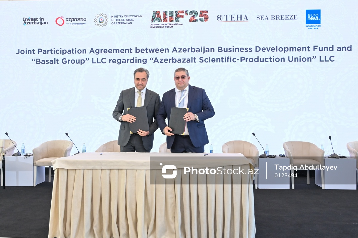I Azərbaycan Beynəlxalq İnvestisiya Forumunun (AIIF 2025) ikinci günündə iştirak edən İqtisadiyyat Nazirliyi yanında Azərbaycan Biznesinin İnkişafı Fondunun (ABİF) baş direktoru Yasin Cəlilov (sol) və “Basalt Group” MMC-nin direktoru Rüfət Bağırov (sağ).