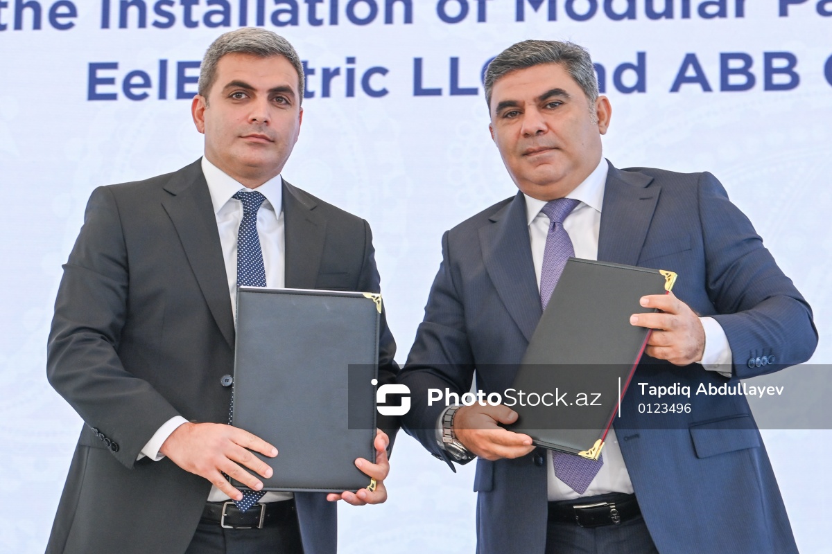 I Azərbaycan Beynəlxalq İnvestisiya Forumunun (AIIF 2025) ikinci günündə Modul Panel Sistemlərinin quraşdırılması üzrə müqavilənin imzalanma mərasimində iştirak edən “Eel Electric” MMC-nin direktoru Vüsal Mirzəyev (sol) və “ABB Group”un “ABB EL” bölməsinin Türkiyə üzrə ölkə meneceri Mahmud Rzayev (sağ).
