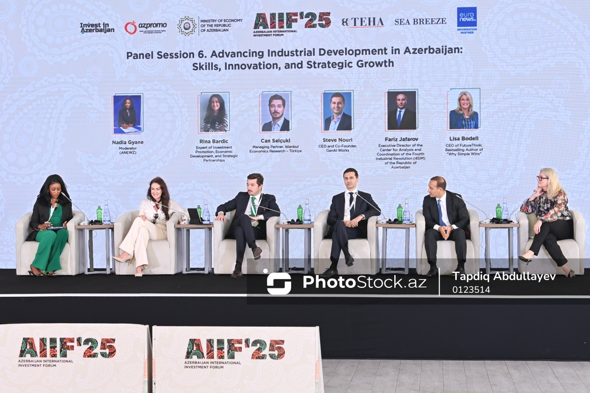 I Azərbaycan Beynəlxalq İnvestisiya Forumunun (AIIF 2025) ikinci günündə iştirak edən (soldan-sağa) moderator, "ANEWZ"un təmsilçisi Nadia Gyane, investisiyaların təşviqi, iqtisadi inkişaf və strateji tərəfdaşlıqlar üzrə ekspert Rina Bardic, "Istanbul Economics Research" şirkətinin idarəedici tərəfdaşı Can Selçuki, "GenAI Works" şirkətinin baş direktoru və həmtəsisçisi Stiv Nuri, İqtisadiyyat Nazirliyi yanında IV Sənaye İnqilabının Təhlili və Koordinasiya Mərkəzinin (4SIM) icraçı direktoru Fariz Cəfərov və “FutueThink” şirkətinin baş icraçı direktoru, “Why Simple Wins” bestsellerinin müəllifi Liza Bodel.