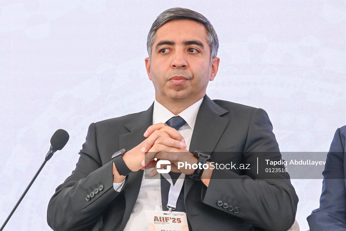 Sentyabrın 23-də Bakıda keçirilən I Azərbaycan Beynəlxalq İnvestisiya Forumunun (AIIF 2025) ikinci günündə iştirak edən İcbari Tibbi Sığorta üzrə Dövlət Agentliyinin İdarə Heyətinin sədri Zaur Əliyev.