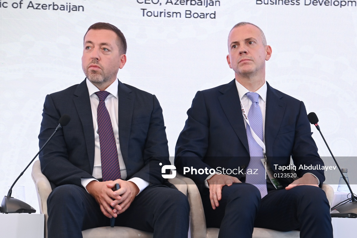 I Azərbaycan Beynəlxalq İnvestisiya Forumunun (AIIF 2025) ikinci günündə iştirak edən "Sea Breeze Medical Valley" şirkətinin rəhbəri Konstantin Grinfeld (sol) və Azərbaycan Turizm Bürosunun İdarə Heyətinin sədri Florian Sengstschmid (sağ).