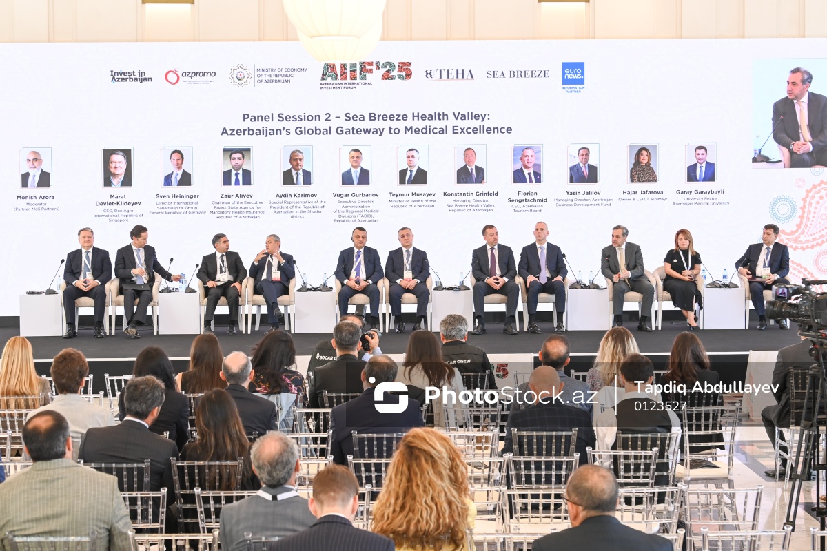 I Azərbaycan Beynəlxalq İnvestisiya Forumunun (AIIF 2025) ikinci günündə iştirak edən (soldan-sağa) "Don Agro International"ın rəhbəri Marat Devlet-Kildeyev, "Sana Hospital Group"un direktoru Sven Heininger, İcbari Tibbi Sığorta üzrə Dövlət Agentliyinin İdarə Heyətinin sədri Zaur Əliyev, Azərbaycan Respublikası Prezidentinin Şuşa rayonunda xüsusi nümayəndəsi Aydın Kərimov, TƏBİB-in İcraçı direktoru Vüqar Qurbanov, Azərbaycan Respublikasının səhiyyə naziri Teymur Musayev, "Sea Breeze Medical Valley" şirkətinin rəhbəri Konstantin Grinfeld, Azərbaycan Turizm Bürosunun İdarə Heyətinin sədri Florian Sengstschmid, İqtisadiyyat Nazirliyi yanında Azərbaycan Biznesinin İnkişafı Fondunun (ABIF) baş direktoru Yasin Cəlilov, "CaspiMayr"in təsisçisi Həcər Cəfərova və Azərbaycan Tibb Universitetinin rektoru Gəray Gəraybəli.