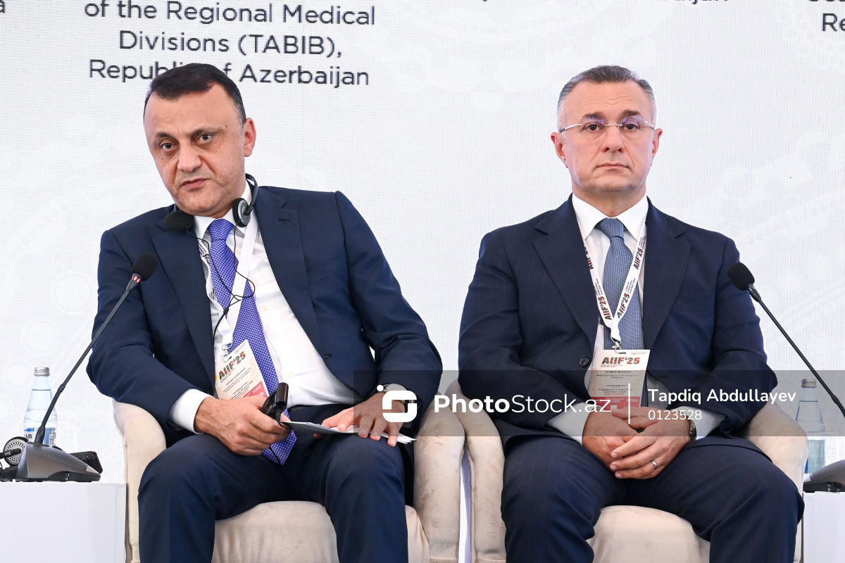I Azərbaycan Beynəlxalq İnvestisiya Forumunun (AIIF 2025) ikinci günündə iştirak edən TƏBİB-in İcraçı direktoru Vüqar Qurbanov (sol) və Azərbaycan Respublikasının səhiyyə naziri Teymur Musayev (sağ).