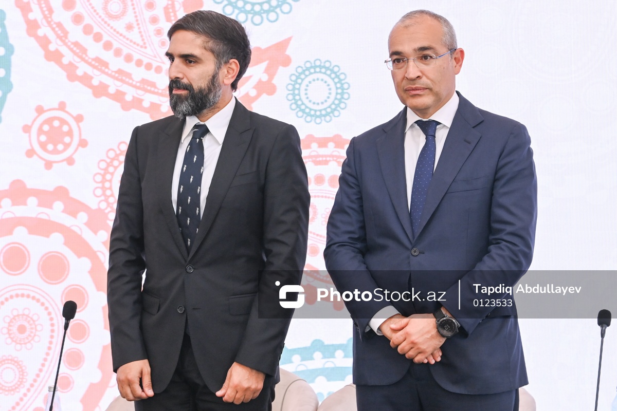 I Azərbaycan Beynəlxalq İnvestisiya Forumunun (AIIF 2025) ikinci günündə iştirak edən Azərbaycan Respublikası Dövlət Neft Şirkətinin (SOCAR) prezidenti Rövşən Nəcəf (sol) və Azərbaycan Respublikasının iqtisadiyyat naziri Mikayıl Cabbarov (sağ).
