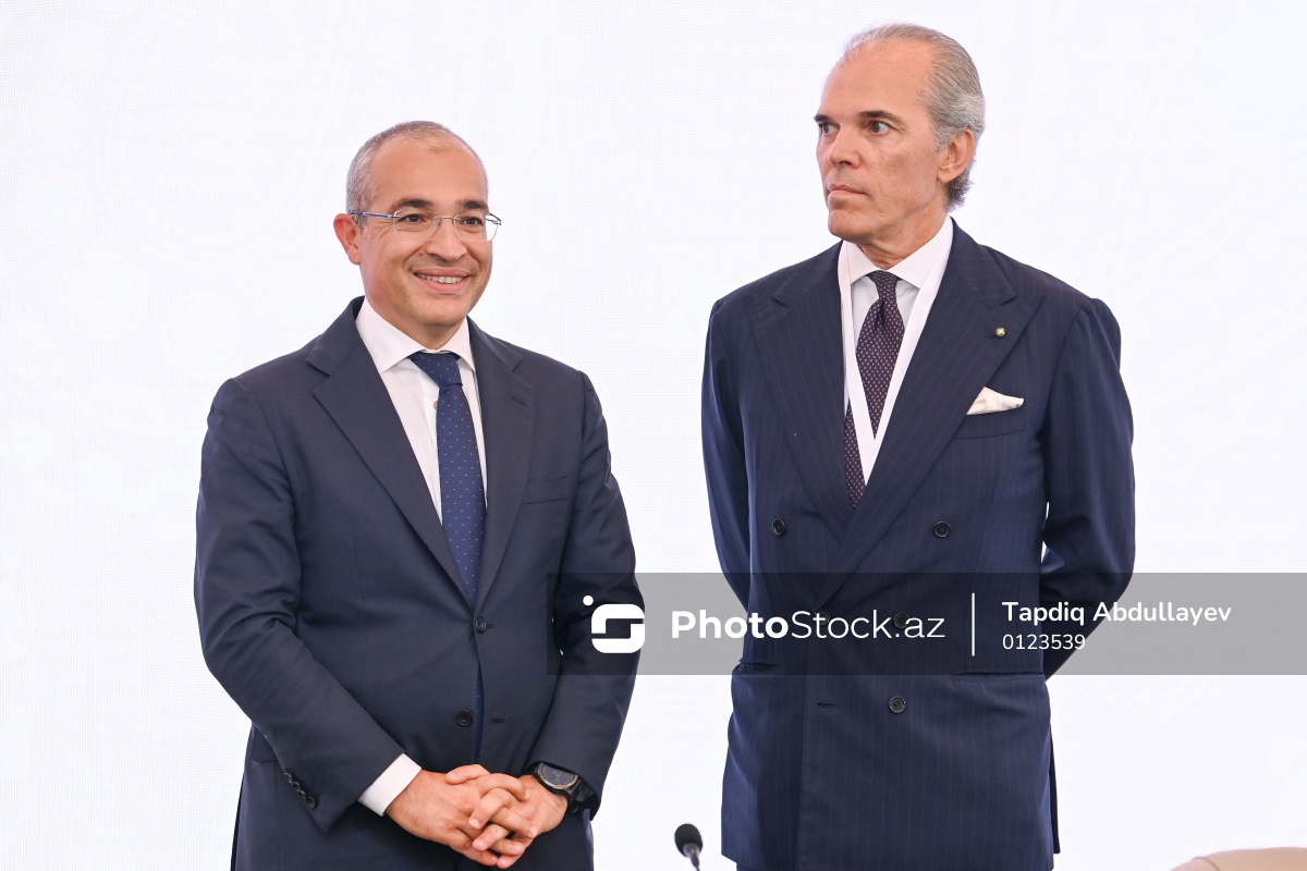 Sentyabrın 23-də Bakıda keçirilən I Azərbaycan Beynəlxalq İnvestisiya Forumunun (AIIF 2025) ikinci günündə iştirak edən Azərbaycan Respublikasının iqtisadiyyat naziri Mikayıl Cabbarov (sol) və "Italiana Petroli S.p.A"nın İdarə Heyətinin sədri Uqo Braçetti Peretti (sağ).
