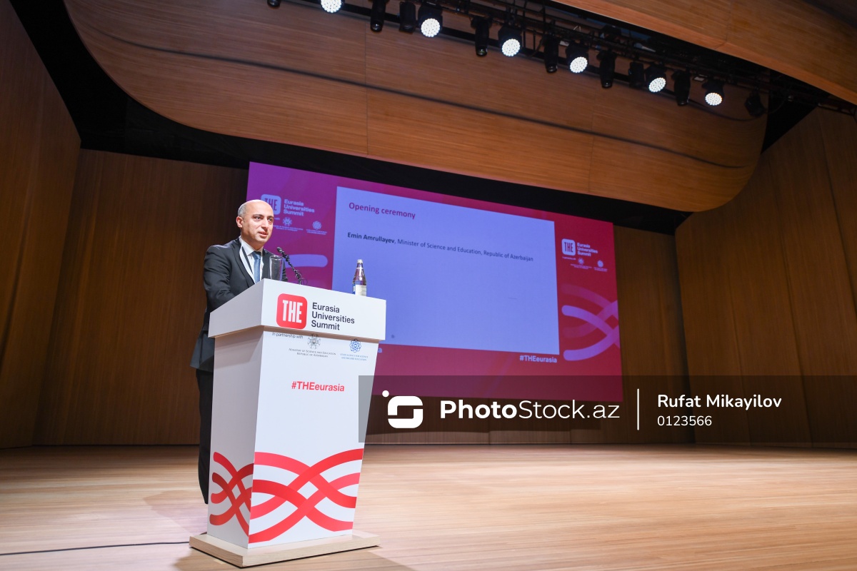 “THE Avrasiya Universitetlərinin Sammiti”ndə çıxış edən Azərbaycan Respublikasının Elm və Təhsil naziri Emin Əmrullayev.
