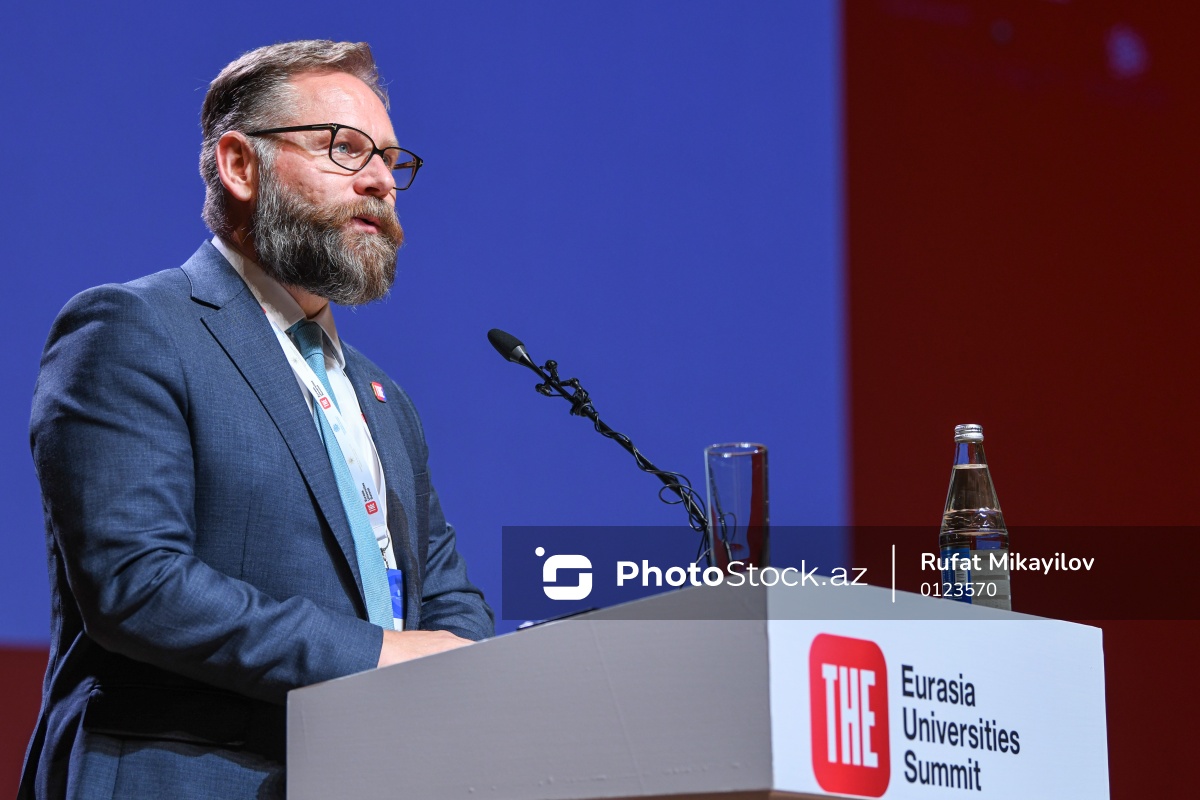 “THE Avrasiya Universitetlərinin Sammiti”ndə çıxış edən "Times Higher Education" təşkilatının qlobal məsələlər üzrə direktoru Fil Beyti.