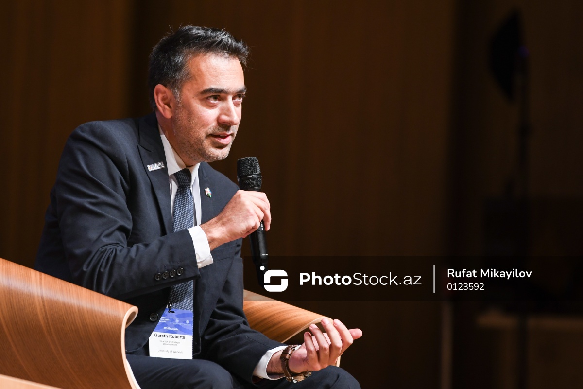 “THE Avrasiya Universitetlərinin Sammiti”ndə çıxış edən Uorik Universitetinin strateji inkişaf direktoru Qaret Roberts.