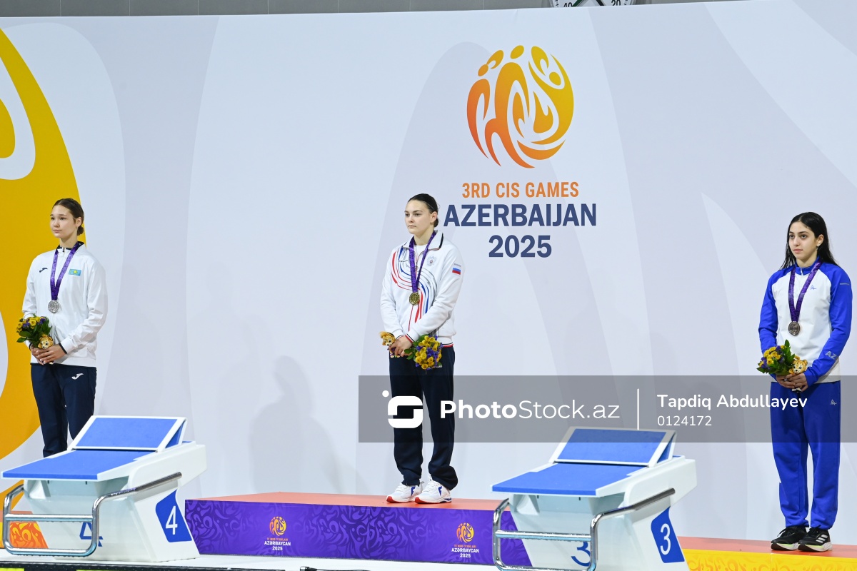 III MDB Oyunları çərçivəsində üzgüçülük yarışında 100 metr məsafəyə "butterfly" üsulu üzrə üzmədə (soldan-sağa) gümüş medal alan qazaxıstanlı üzgüçü Taissiya Korotkova, qızıl medal alan rusiyalı üzgüçü Yevgenia Sadovnikova və bürünc medal alan azərbaycanlı üzgüçü Mehri Əbdürəhmanlı.