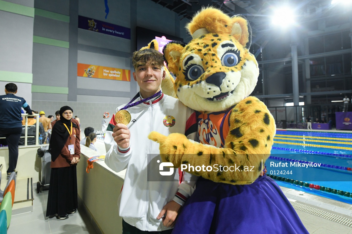 III MDB Oyunları çərçivəsində üzgüçülük yarışında 1500 metr məsafəyə sərbəst üsulla üzmədə qızıl medal alan rusiyalı üzgüçü Aleksandr Filipets (sol) və III MDB Oyunlarının maskotu Leyla (sağ).