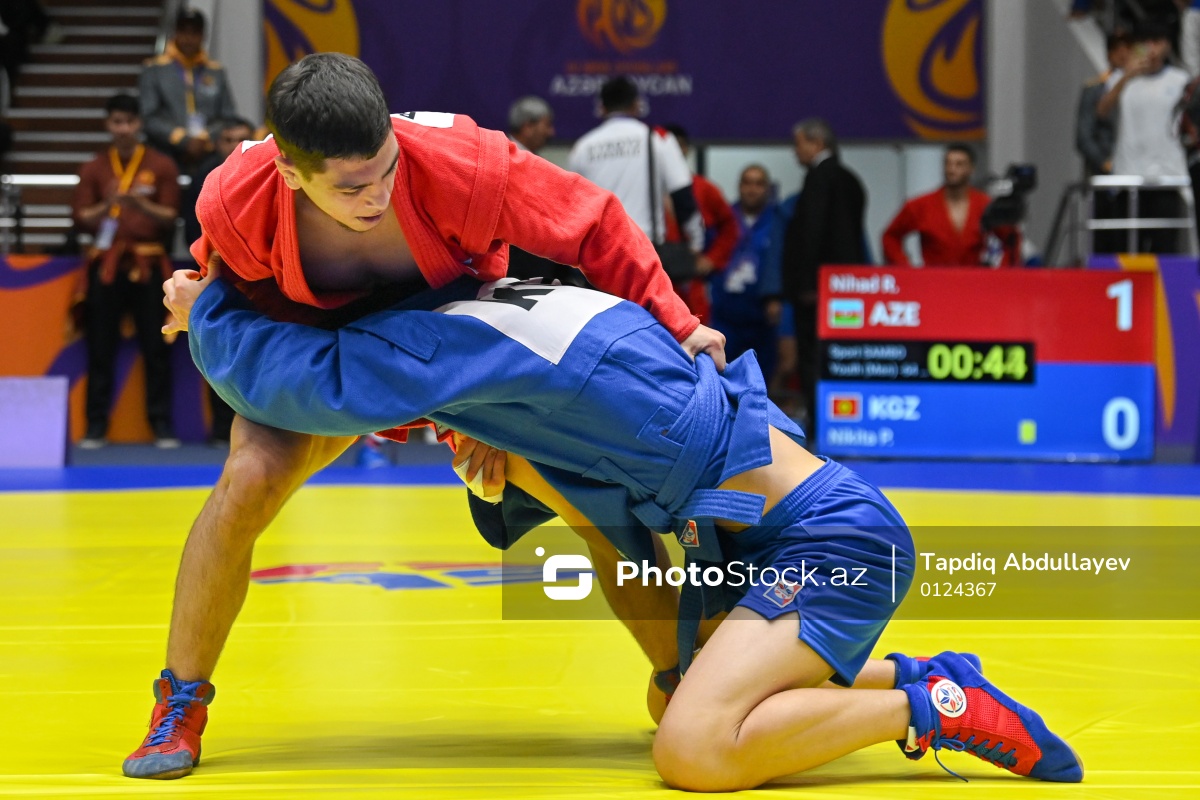 Sentyabrın 29-da Göygöl Olimpiya Kompleksində III MDB Oyunları çərçivəsində sambo üzrə yarışlar keçirilib. 1/4 final mərhələsində 64 kq çəki dərəcəsində yarışan Azərbaycan samboçusu Nihad Rəhimov (sol) Qırxızıstan idmançısı Nikita Pakı (sağ) 7:0 hesabı ilə məğlub edib.