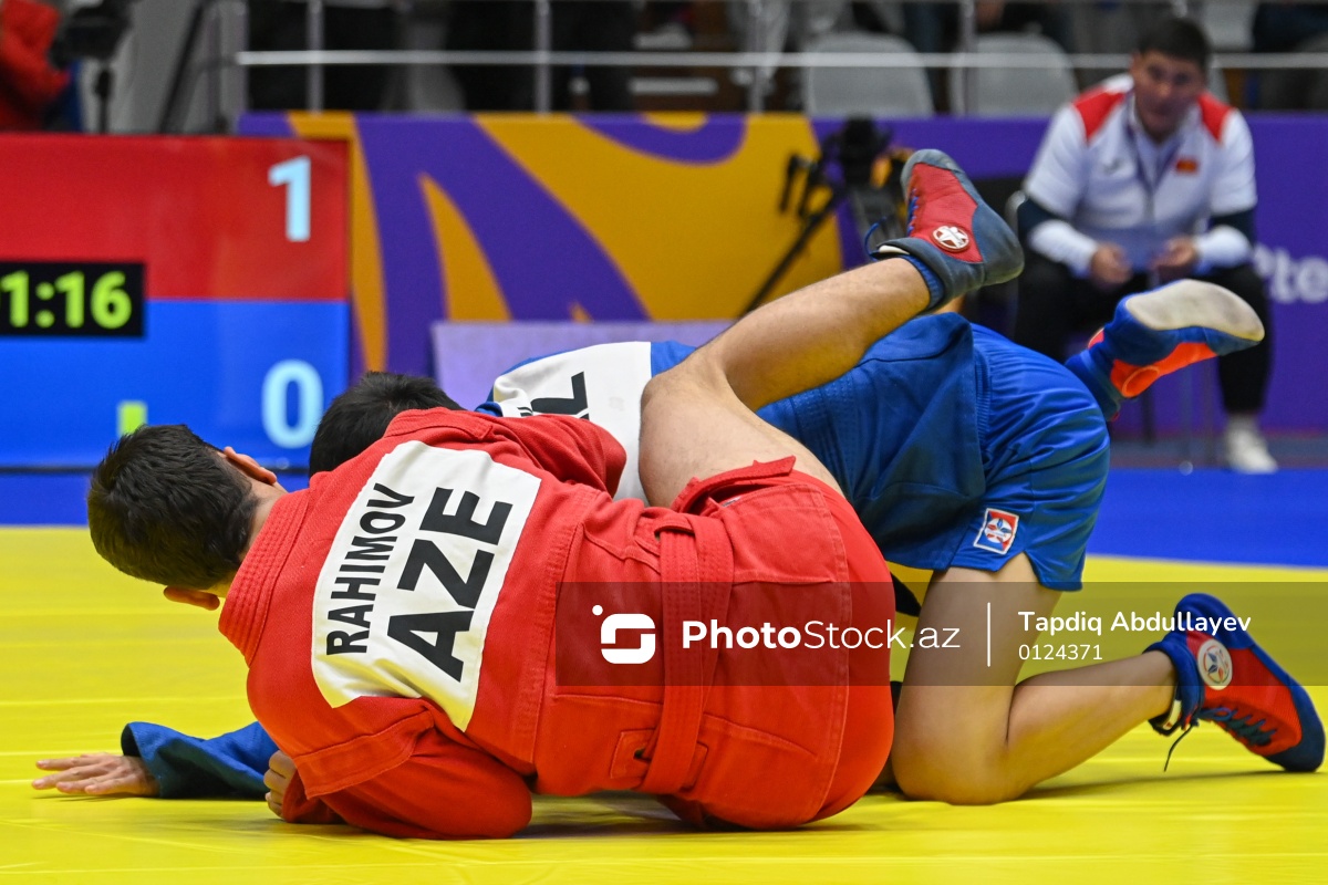 Sentyabrın 29-da Göygöl Olimpiya Kompleksində III MDB Oyunları çərçivəsində sambo üzrə yarışlar keçirilib. 1/4 final mərhələsində 64 kq çəki dərəcəsində yarışan Azərbaycan samboçusu Nihad Rəhimov (sol) Qırxızıstan idmançısı Nikita Pakı (sağ) 7:0 hesabı ilə məğlub edib.