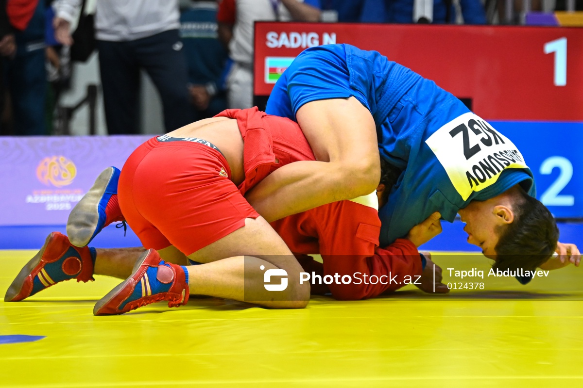 Sentyabrın 29-da Göygöl Olimpiya Kompleksində III MDB Oyunları çərçivəsində sambo üzrə yarışlar keçirilib. 1/4 final mərhələsində 79 kq çəki dərəcəsində yarışan Azərbaycan samboçusu Sadiq Nadirov (sol) qırğızıstanlı Maral Serikovich Baibosunova (sağ) 1:2 hesabı ilə məğlub olub.