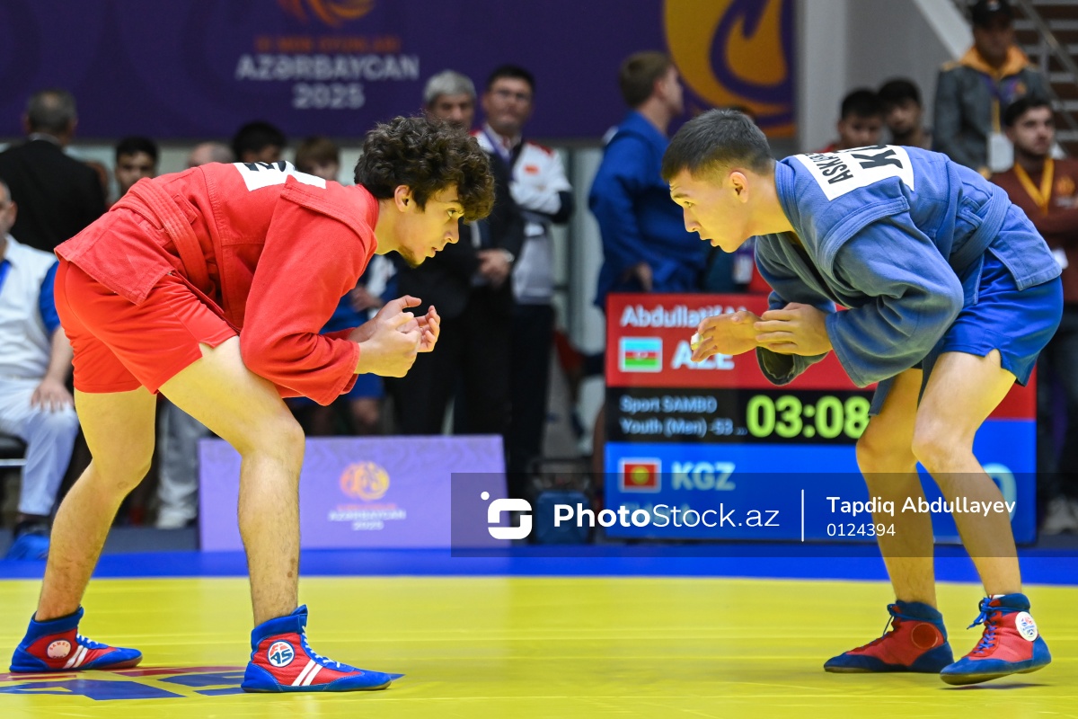 Sentyabrın 29-da Göygöl Olimpiya Kompleksində III MDB Oyunları çərçivəsində sambo üzrə yarışlar keçirilib. Yarımfinal mərhələsində 53 kq çəki dərəcəsində yarışan Azərbaycan samboçusu Əbdüllətif Musayev (sol) qırğızıstanlı idmançı Eldar Askarbekova (sağ) 1:0 hesabı ilə qalib gəlib.
