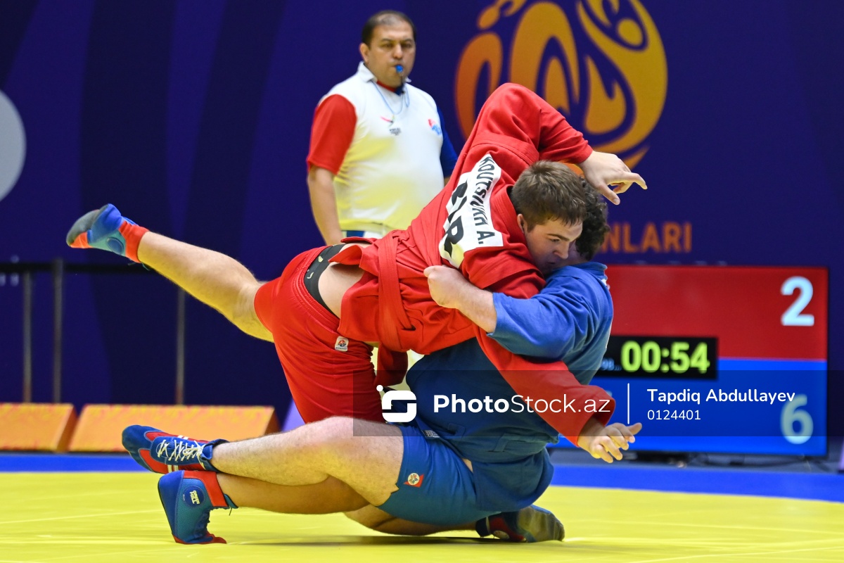 Sentyabrın 29-da Göygöl Olimpiya Kompleksində III MDB Oyunları çərçivəsində sambo üzrə yarışlar keçirilib. 1/4 final mərhələsində +98 kq çəki dərəcəsində yarışan Belarus idmançısı Artsiom Koutsiukh (sol) Azərbaycan samboçusu Rəsul Səmədliyə (sağ) 3:8 hesabı ilə məğlub olub.