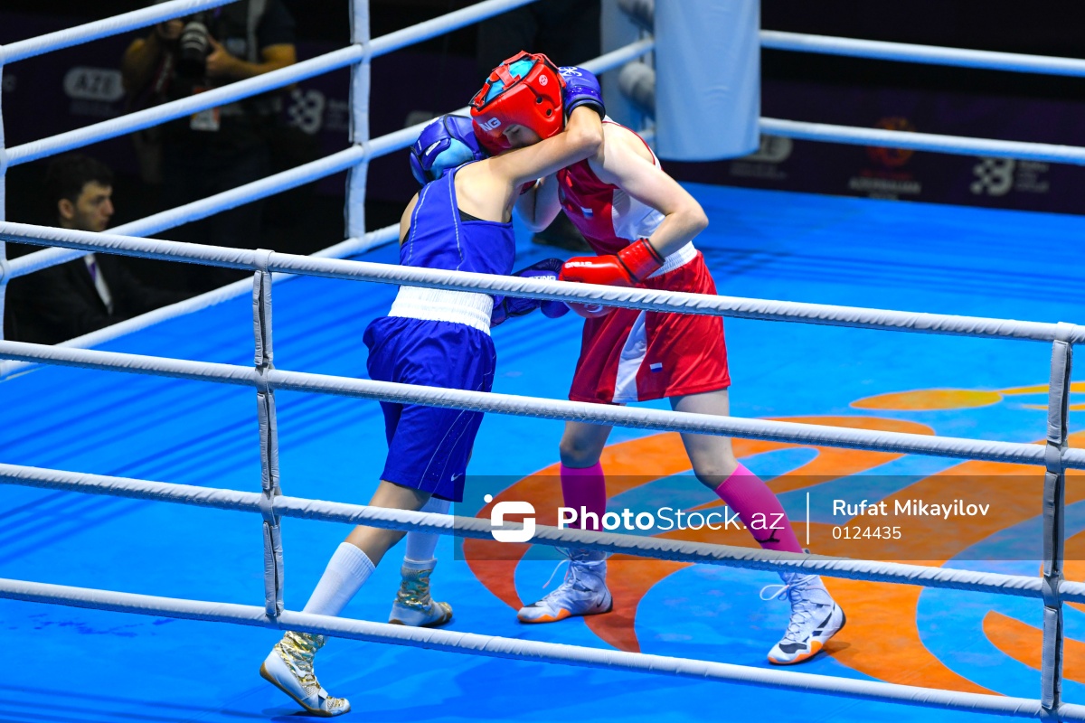 Sentyabrın 29-da III MDB Oyunları çərçivəsində Yevlax Olimpiya İdman Kompleksində boks yarışlarına start verilib. Qadınlar arasında 1/4 final mərhələsində 50 kq çəki dərəcəsində yarışan qazaxıstanlı boksçu Aruzhan Bakhytbek (sol) Rusiya boksçusu Diana Kuznetsovaya (sağ) 0:5 hesabı ilə məğlub olub.