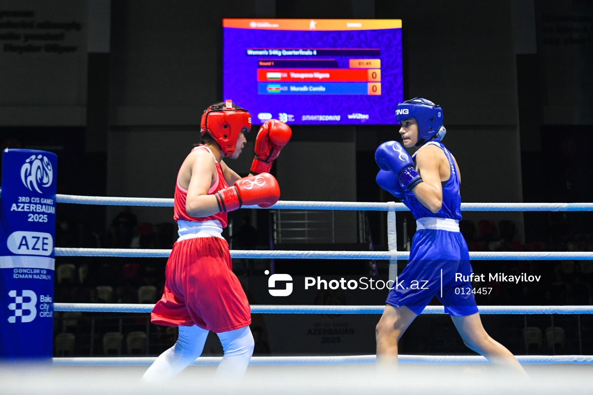Sentyabrın 29-da III MDB Oyunları çərçivəsində Yevlax Olimpiya İdman Kompleksində boks yarışlarına start verilib. Qadınlar arasında 1/4 final mərhələsində 54 kq çəki dərəcəsində yarışan Tacikistan təmsilçisi Nigora Yusupova (sol) və azərbaycanlı boksçu Cəmilə Muradlı (sağ) arasındakı qarşılaşma 0:0 hesabı ilə nəticələnib. Azərbaycan təmsilçisi qarşılaşmadan qalib ayrılıb.