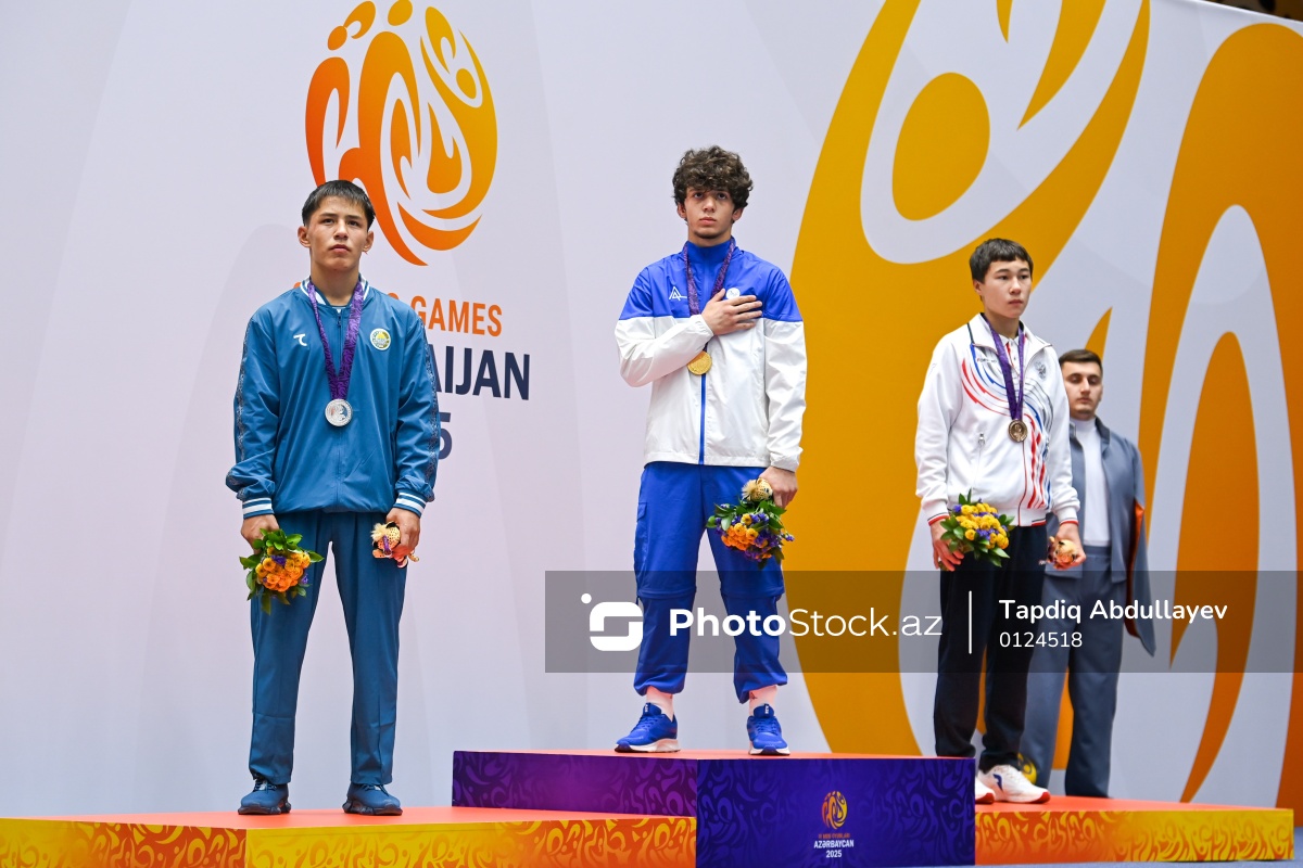 III MDB Oyunları çərçivəsində sambo üzrə yarışın mükafatlandırma mərasimində iştirak edən (soldan-sağa) gümüş medal alan özbəkistanlı samboçu Qamzat Maksetbayev, qızıl medal alan azərbaycanlı idmançı Əbdüllətif Musayev və bürünc medal alan rusiyalı samboçu Askar Baidushev.