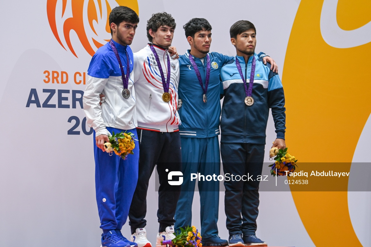 III MDB Oyunları çərçivəsində sambo üzrə 58 kq çəki dərəcəsində yarışan (soldan-sağa) gümüş medal mükafatçısı azərbaycanlı samboçu Rüstəm Qasımzadə, qızıl medal qazanan Rusiya samboçusu Ismail Makhozhev, bürünc medal mükafatçıları özbəkistanlı samboçu Avazbek Ergashev və Qazaxıstan samboçusu Sayat Nurzhan.