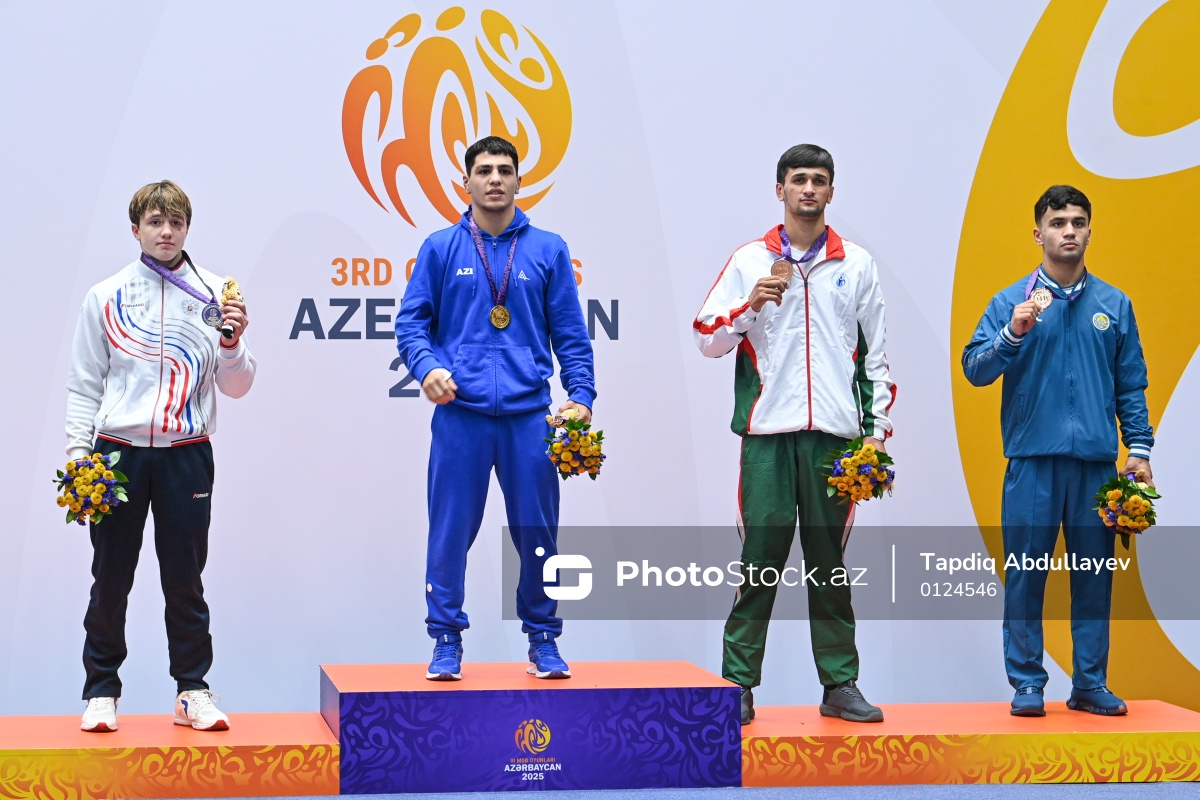 III MDB Oyunları çərçivəsində sambo üzrə 64 kq çəki dərəcəsində yarışan (soldan-sağa) gümüş medal mükafatçısı rusiyalı samboçu Artem Karisov, qızıl medal alan Azərbaycan samboçusu Nihad Rəhimov, bürünc medal mükafatçıları Tacikistan samboçusu Nazarali Kholov və özbəkistanlı samboçu Davlatjon Kozimov.