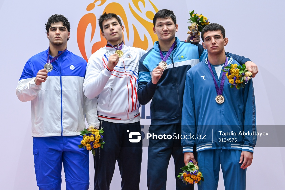 III MDB Oyunları çərçivəsində sambo üzrə 98 kq çəki dərəcəsində yarışan (soldan-sağa) gümüş medal mükafatçısı azərbaycanlı samboçu Əbubəkir Hüseynov, qızıl medal qazanan Rusiya samboçusu Elisei Simonenko, bürünc medal mükafatçıları qazaxıstanlı samboçu Mukhammed Serik və Özbəkistan samboçusu Saidahmad Ravshanov.