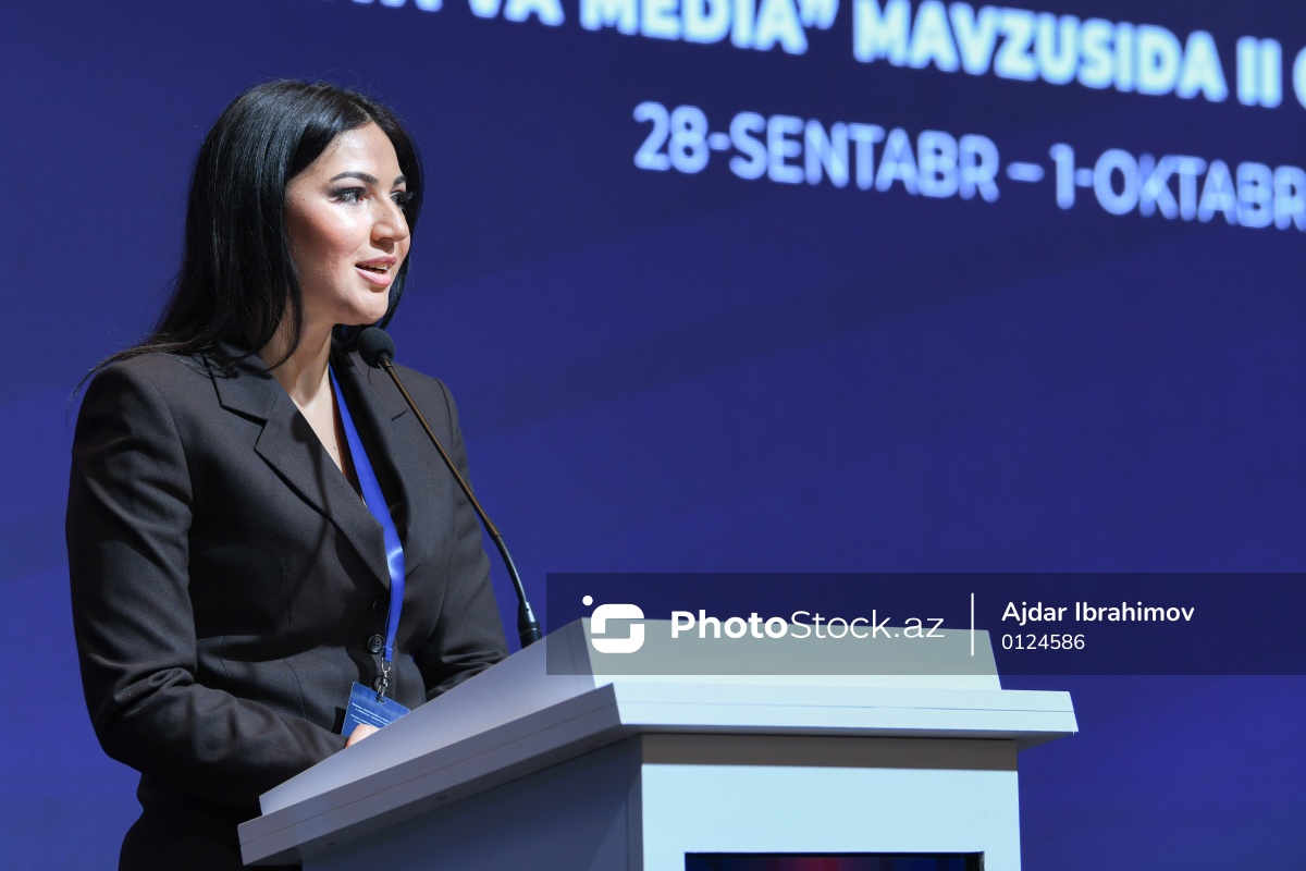 "Rəqəmsal transformasiya və media" mövzusunda II Azərbaycan-Özbəkistan Media Forumunun açılış mərasimində çıxış edən Medianın İnkişafı Agentliyinin Kommunikasiya və informasiya texnologiyaları departamentinin Kommunikasiya şöbəsinin müdiri Səidə Şəfiyeva.