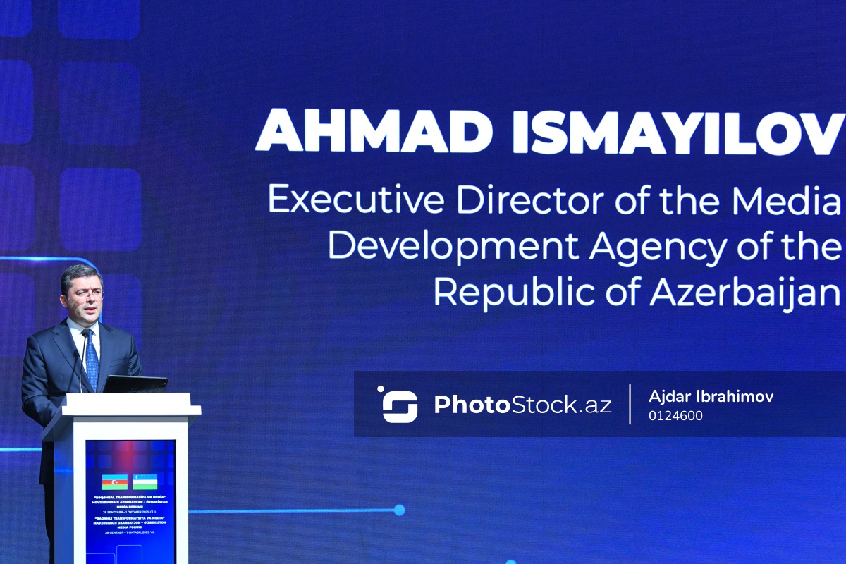 "Rəqəmsal transformasiya və media" mövzusunda II Azərbaycan-Özbəkistan Media Forumunun açılış mərasimində çıxış edən Medianın İnkişafı Agentliyinin (MEDİA) icraçı direktoru Əhməd İsmayılov.