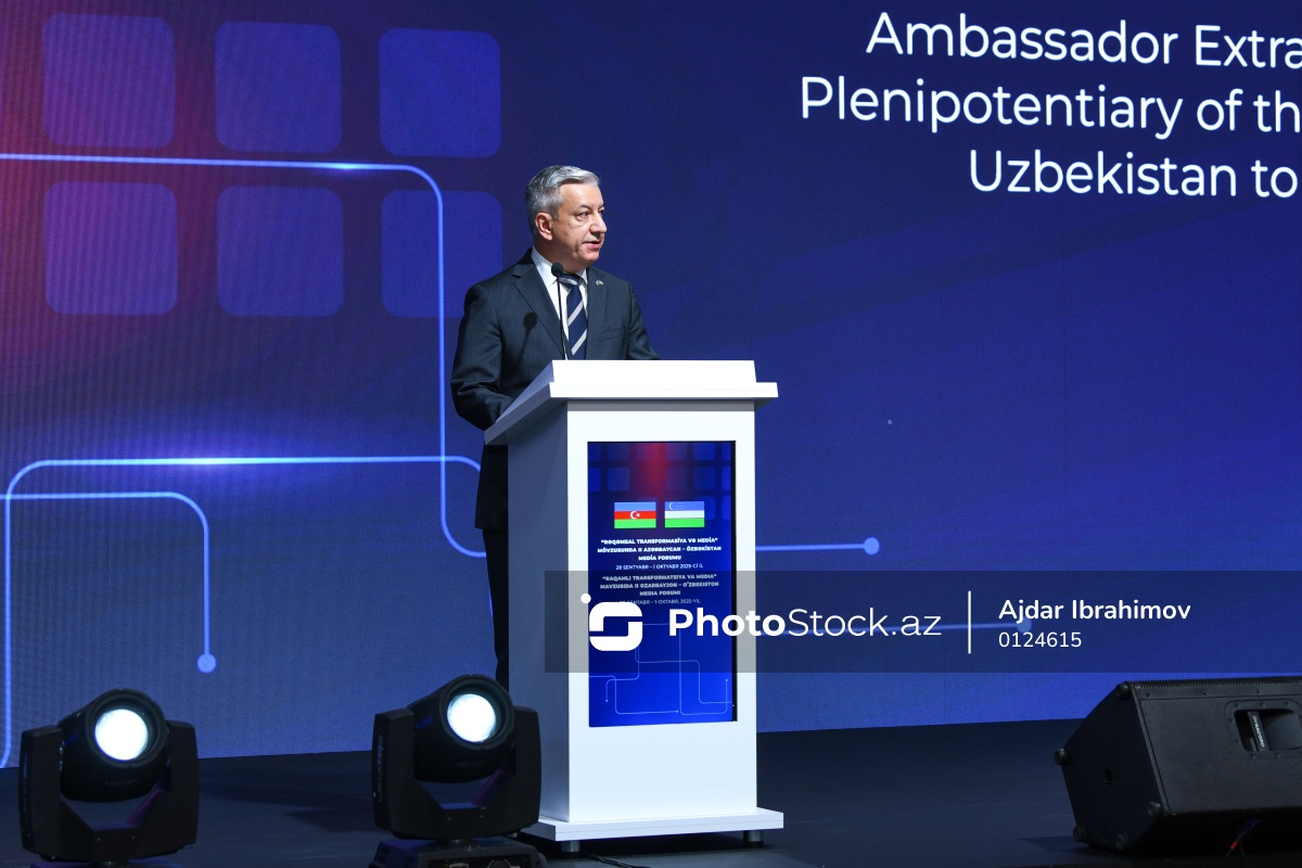 "Rəqəmsal transformasiya və media" mövzusunda II Azərbaycan-Özbəkistan Media Forumunun açılış mərasimində çıxış edən Özbəkistanın Azərbaycandakı səfiri Bahrom Aşrafxanov.