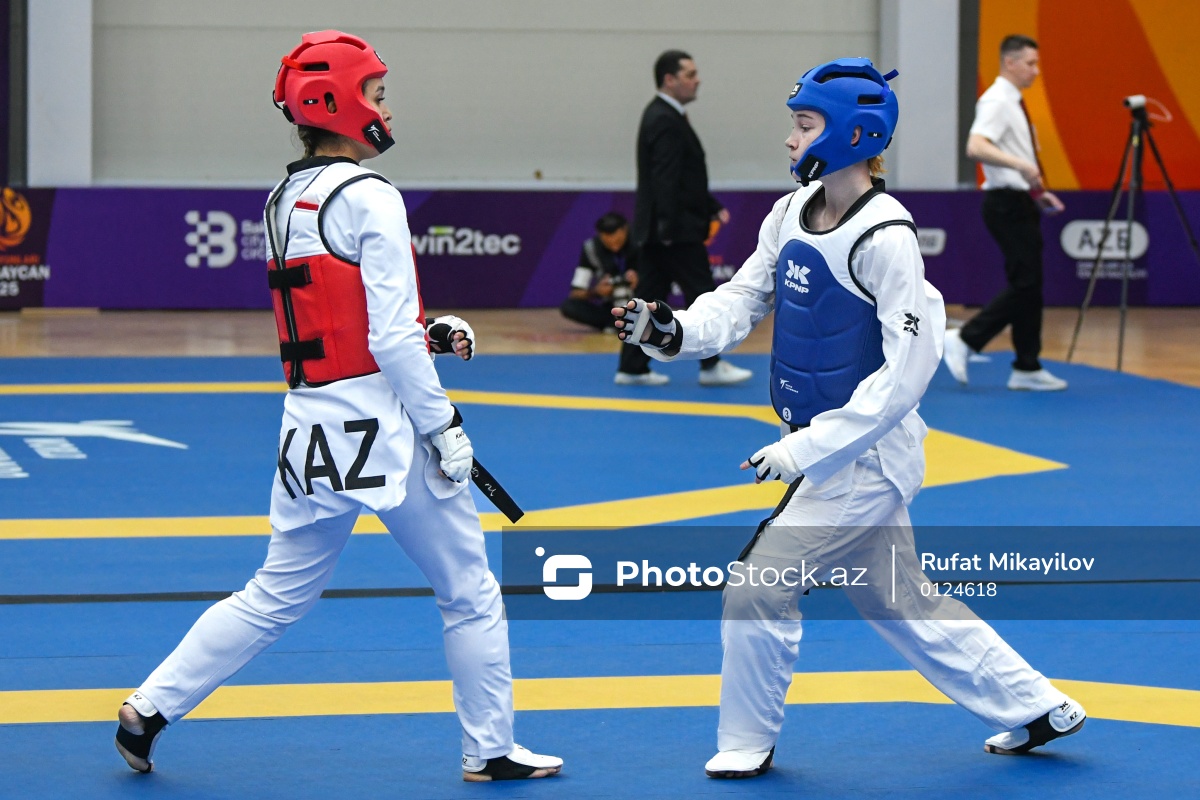 Sentyabrın 30-da III MDB Oyunları çərçivəsində Mingəçevirdəki “Kür” Olimpiya Tədris-İdman Mərkəzində taekvondo yarışları keçirilib. Qadınlar arasında 67 kq çəki dərəcəsində yarışan Qazaxıstan təmsilçisi Ayazhan Saparkhan (sol) Belarus taekvondoçusu Darya Navitskayanı (sağ) 2:1 hesabı ilə məğlub edib.